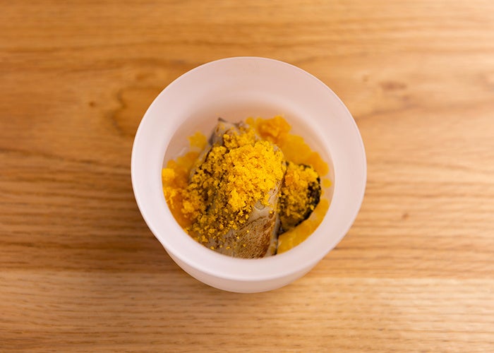 1つ1つむいて、65度の低温でやわらかく炊き上げ、すった唐墨を合わせました。