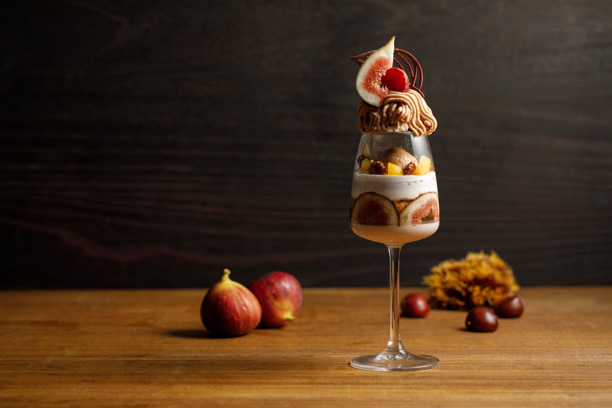 モンブラン・ムース・パンナコッタにトッピングの甘露煮まで、栗をたっぷり使用した秋を感じるパフェ。胡桃のキャラメリゼ、クランブル、メレンゲの多彩な食感がアクセントとなり、香り高い旬のいちじくとともに深まる秋の色彩を表現しました。
