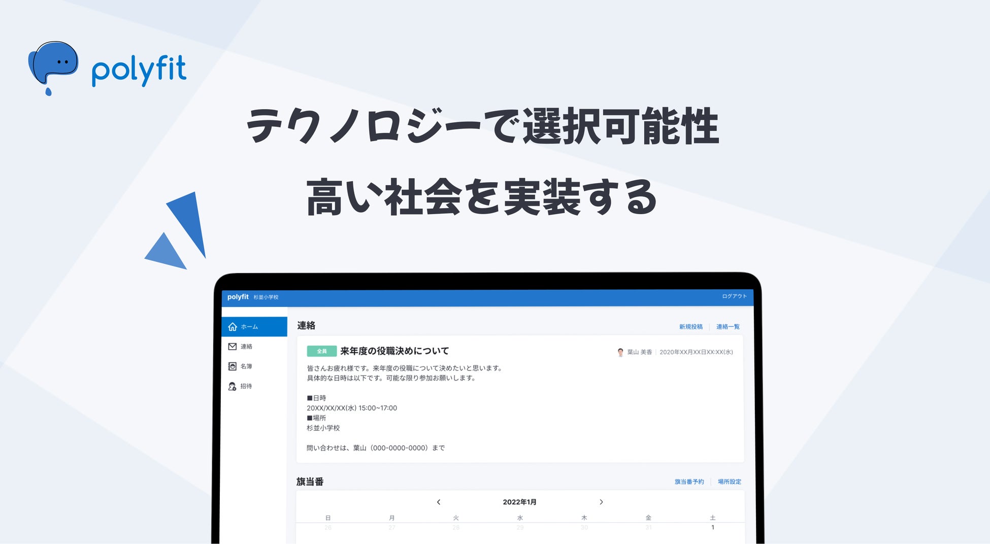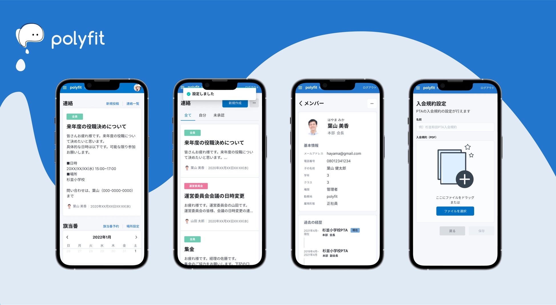 「テクノロジーで選択可能性⾼い社会を、実装する」をミッションとするソフトウェア開発会社のpolyfit株式会社(本社:東京都杉並区、代表取締役CEO:⼤薮 聡史)はクラウドPTA活動⽀援ソフト『polyfit(ポリフィット)』のサービス提供を開始しました。「忙しい保護者でも⼿軽に使える」サービスとして、『polyfit』を⽤いた名簿管理およびそれを活⽤したデジタルネイティブなPTA活動を提案します。