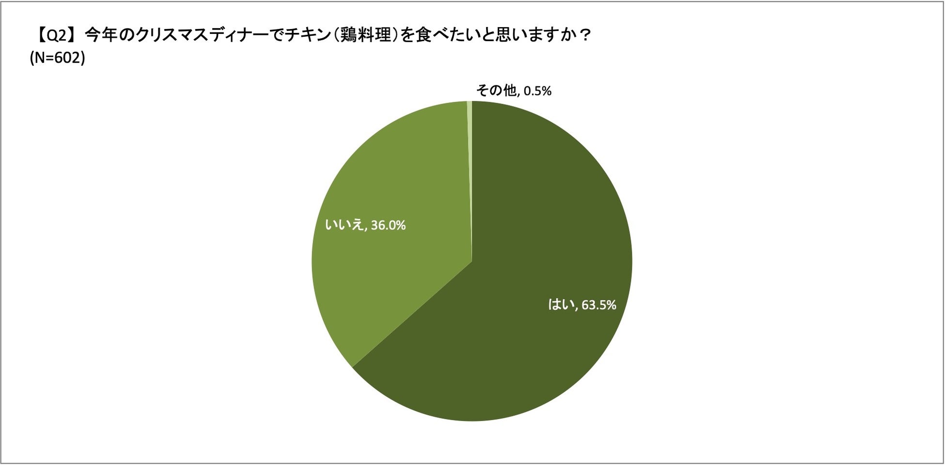 今年のクリスマスディナーでチキンを食べたいか尋ねたところ、「はい」が63.5%、「いいえ」が36.0%、「その他」が0.5%と、約3人に2人がクリスマスにチキンを食べたいと回答しました。