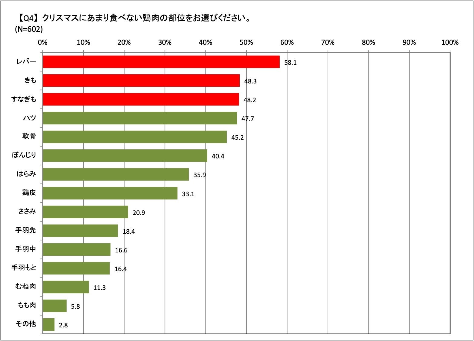 一方で、クリスマスにあまり食べない鶏肉の部位を尋ねたところ、1位「レバー(ハツなし)」、2位「きも(ハツ付き)」、3位「すなぎも」と内臓系の部位があまり食べられないことが明らかになりました。