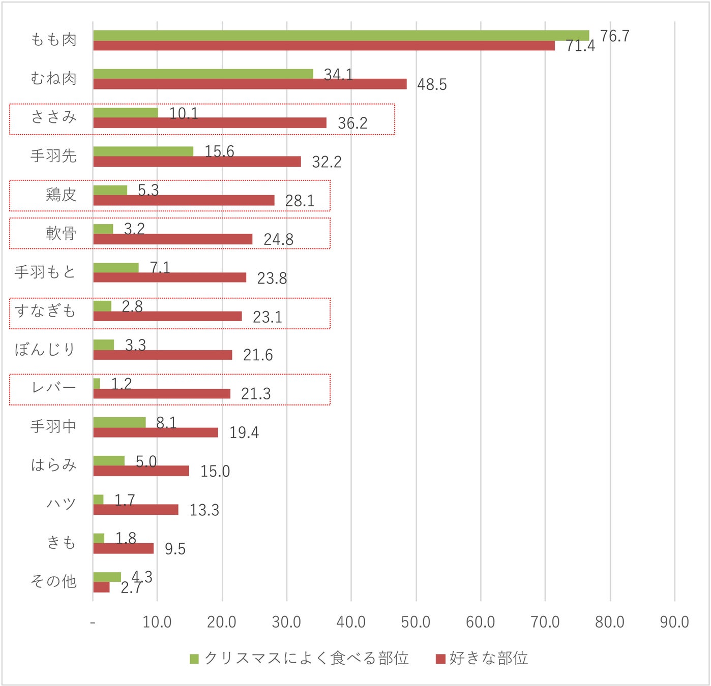 さらに、過去に調査(2023年9月「鶏肉に関する意識調査」)した”鶏肉の好きな部位”と、”クリスマスによく食べる部位”を比較したところ、レバー、すなぎもなどの内臓系、ささみや軟骨、鶏皮は、20ポイント以上ギャップがあり、好きな部位ではあるもののクリスマスにはあまり食べない“モテない”チキンということがわかりました。