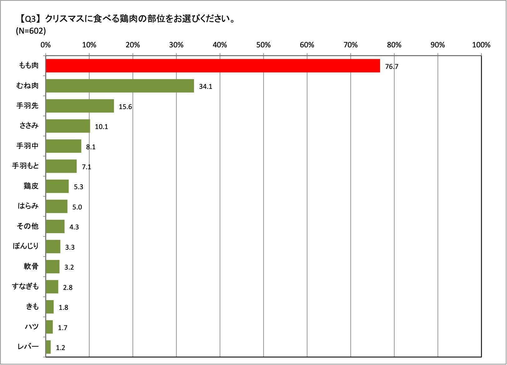 クリスマスに食べる鶏肉の部位を尋ねたところ、クリスマスの定番料理で使用されるもも肉が圧倒的に人気という結果になりました。