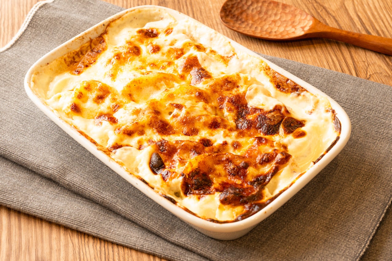 1.グラタン皿にオリーブオリーブオイルを少量入れ、にんにくの断面を内側全体にこすりつける。