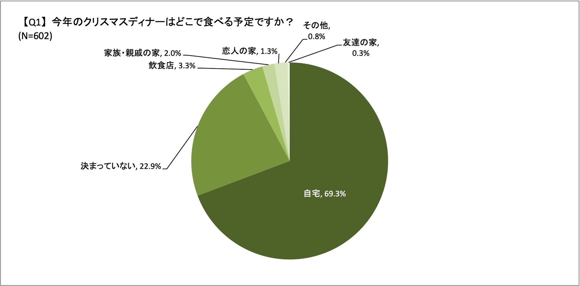 今年のクリスマスディナーはどこで食べる予定か尋ねたところ、「自宅」と回答した人が69.3%と最も多く、「特に決まっていない」の22.9%が次点の回答でした。