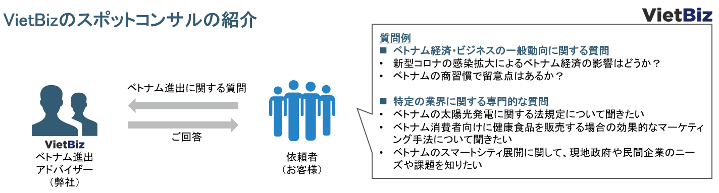 スポットコンサルティングとは、ベトナム市場動向の情報収集にお困りの日本企業のお客様にタイムリーにご質問回答・ご提言するサービスです。
