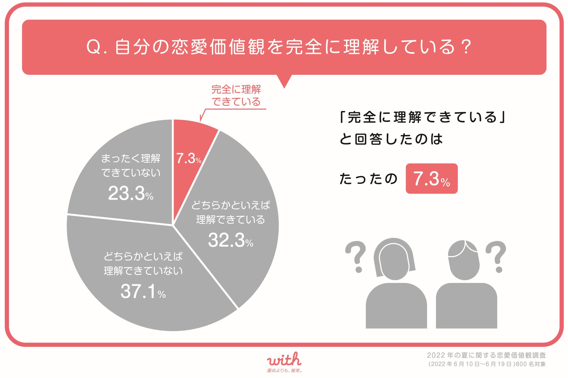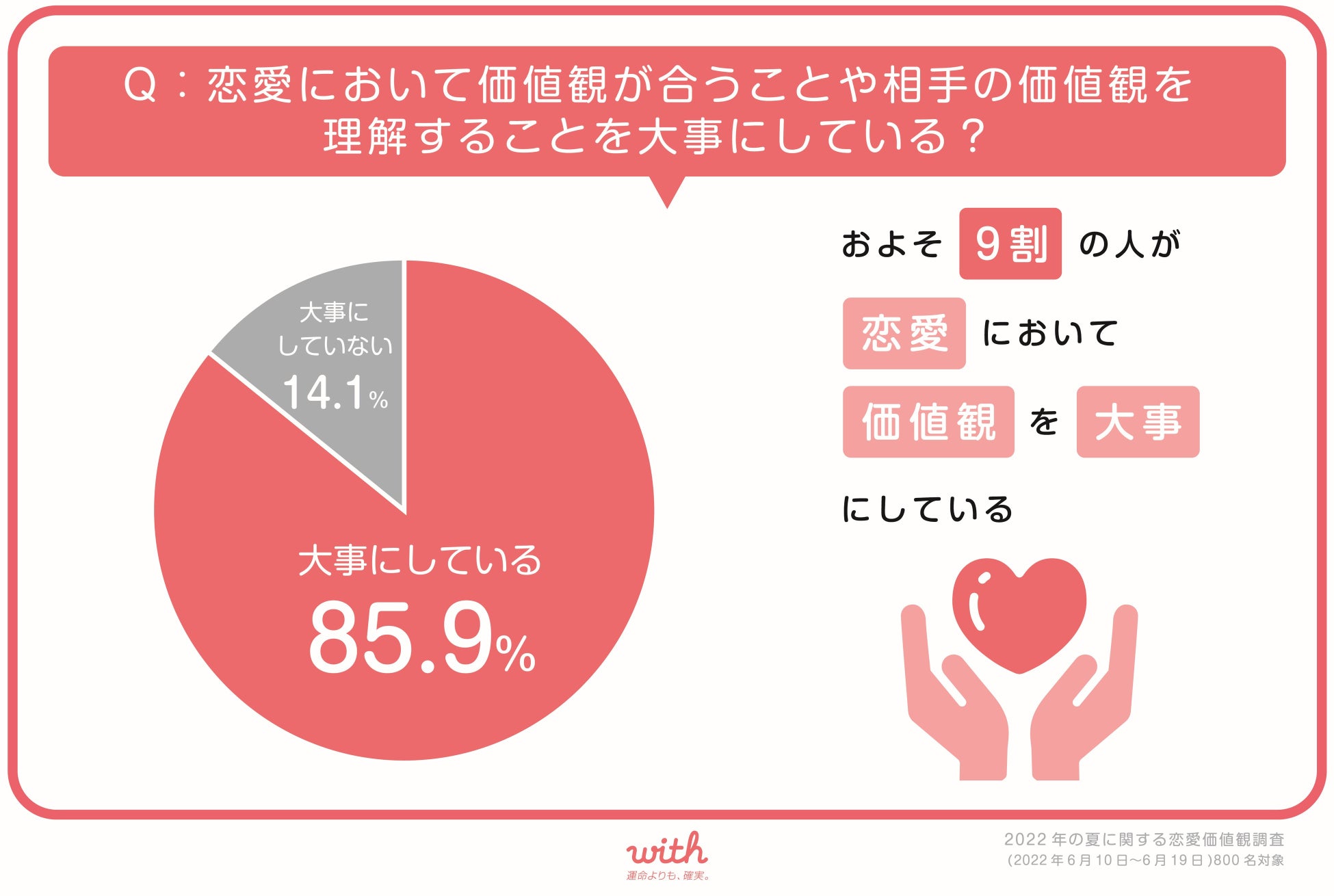 昨今、コロナ禍で生活変容や多様化が進む中で、恋人やパートナーを選ぶ基準が外見や肩書きではなく、「内面」や「価値観」を重視する傾向が見られています。withは全国の18〜39歳男女800名を対象にした「2022年の夏に関する恋愛価値観調査」を実施したところ、約86%が「恋愛において価値観が合うことを大事にしている」と回答したことがわかりました。一方で、多くの人がそもそも自身の重要視している価値観がわかっていなかったり、お付き合いを開始した後に自分と恋人との間で、重要視している価値観に差異が生じてしまう事象が起きています。調査では、「自分の恋愛価値観を完全に理解できている」と答える人が約7%という結果に留まりました。自分の恋愛価値観について大事にしたいけど、理解できていない「恋愛価値観の自己認識ギャップ」が起きているといえます。そこでwithは、ご自身の恋愛価値観をもっと知ってもらうための場所として「健恋診断」を企画しました。