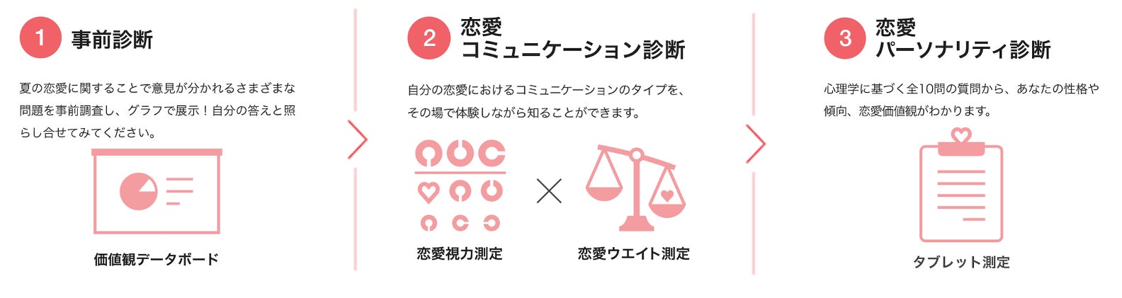 所要時間は、なんと5分!受診コースは、まず、「事前診断」で夏の恋愛において意見の割れやすい問題をチェック。続いて、「恋愛コミュニケーション診断」では2種類の診断「恋愛視力測定」「恋愛ウエイト測定」で、それぞれ自分の恋愛におけるコミュニケーションタイプを体験しながら知ることができます。最後に「恋愛パーソナリティ診断」では、心理学に基づく全10問から、自分の性格や恋愛傾向についてタブレットで測定できます。全ての診断を終えた方へ、「あなたの恋愛価値観」の診断結果をその場でお渡し、さらに、診断結果と合わせて、この夏あなたの恋をちょっと前向きにする恋愛アイテム 「恋の処方箋」をプレゼントしております。