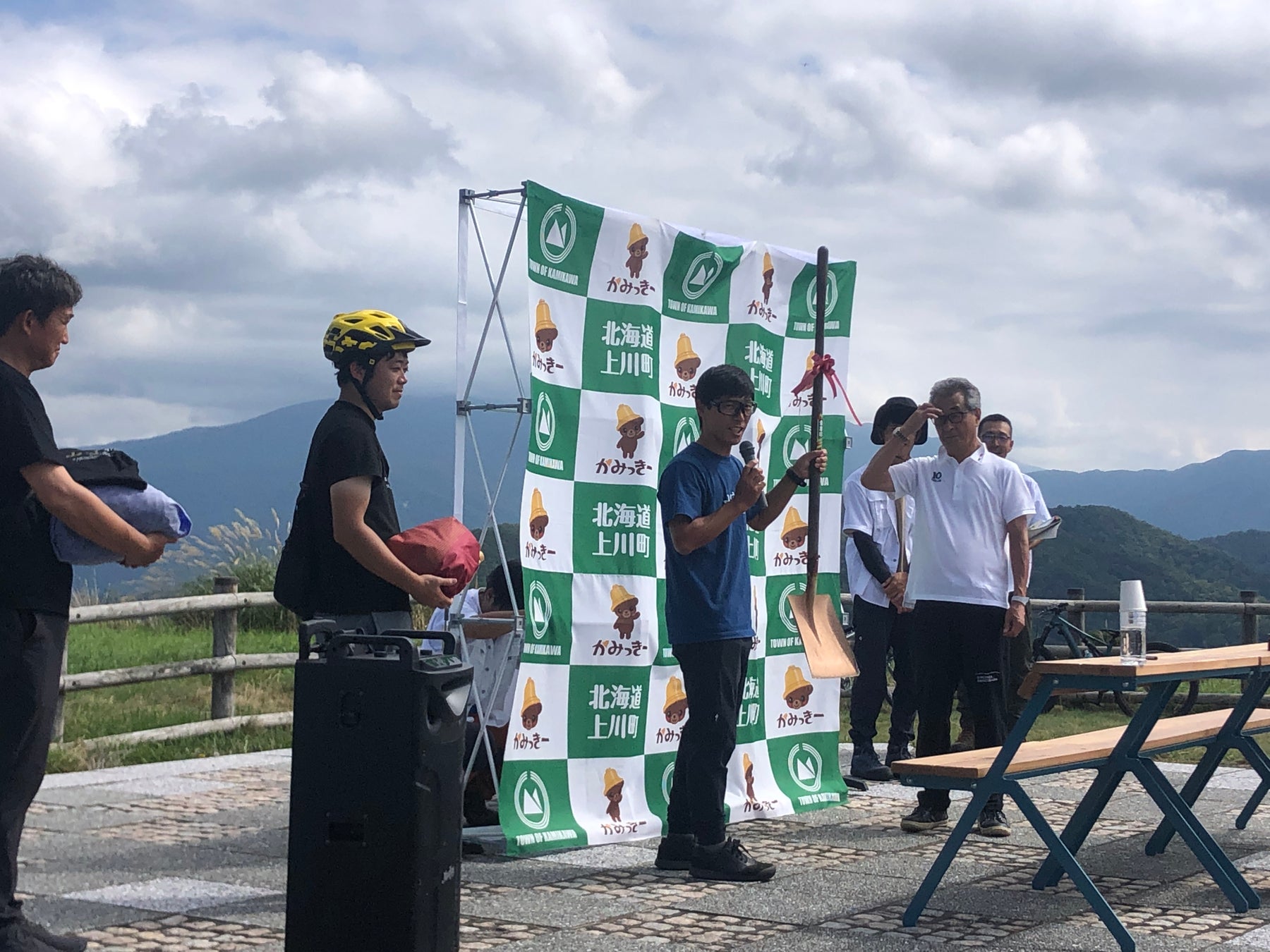 役場スタッフがこの日まで一生懸命に手作りでイベント準備をして、多くの方々にこの上川町の新たな門出を祝いつつ、素晴らしい環境を楽しんで頂こうと当日も忙しく動き回っていました。北海道運輸局、上川ファミリーオートキャンプ村を運営する株式会社KOUZUKI、ヤマハ発動機株式会社、知床サイクリングサポート、山守人のメンバーも駆け付けてスタッフとしてイベント運営のサポートにまわりました。山守人はイベント全体の準備から当日までの総合サポートを行いました。