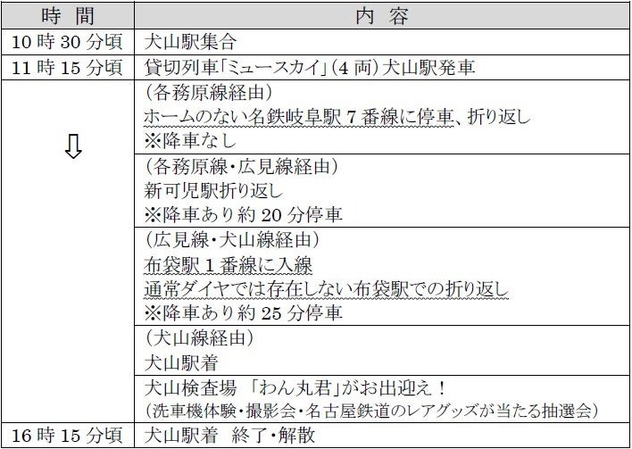 本商品は、本年6月26日に開催し、大変好評をいただいた旅行商品の第2弾となります。第1弾と同様、空港特急「ミュースカイ」(全車特別車)として運行している2000系車両を貸切列車にして沿線各所を巡るもので、通常ダイヤでは「ミュースカイ」を運行していない各務原線を走行するほか、普段はお客さまが乗車して入場することがない車両基地「犬山検査場」へ乗り入れ、洗車機体験や写真撮影会、名古屋鉄道のレアグッズ抽選会などを行います。また今回は、犬山線開通110周年を記念して、犬山検査場に犬山市の公式キャラクター「わん丸君」が登場するほか、貸切列車に記念系統板を掲出して運行します。