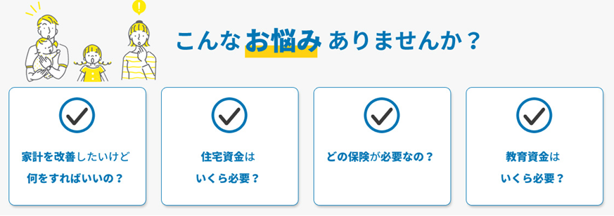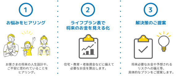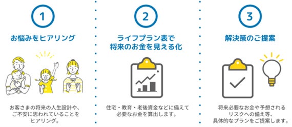 具体的には、当社および東京海上日動あんしん生命が提携する経験・実績豊富なファイナンシャルプランナーが、お客さまの家計状況や家族構成、将来の夢などをお聞きし、住宅・教育・老後資金などを「見える化」するライフプラン表を作成いたします。そのうえで、お客さまの資金計画やリスクに備え、夢の実現に寄り添う解決策をご提案いたします。ファイナンシャルプランナーへのご相談は無料であり、お客さまのご都合にあわせて、ご自宅への訪問やオンラインなどで面談できます。