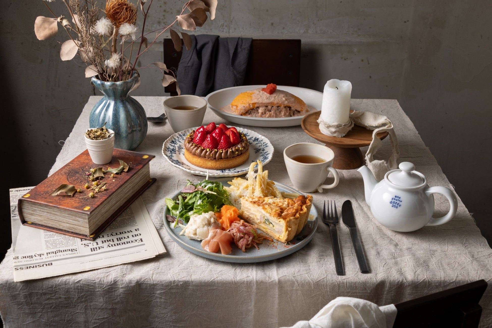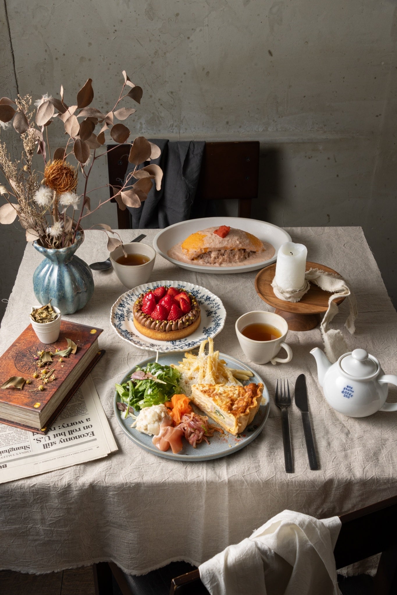 アンティーク調の小物やドライフラワーで飾られた店内のショーケースには、パティシエ達がその日おつくりした、色彩豊かなタルトがずらりと並びます。ペアリングのためにご用意したハーブティーや、旬の素材をつかった料理も一緒にお愉しみいたけます。日常使いにも、特別な日にも、お客さまの素敵な時間を演出できればと考えています。