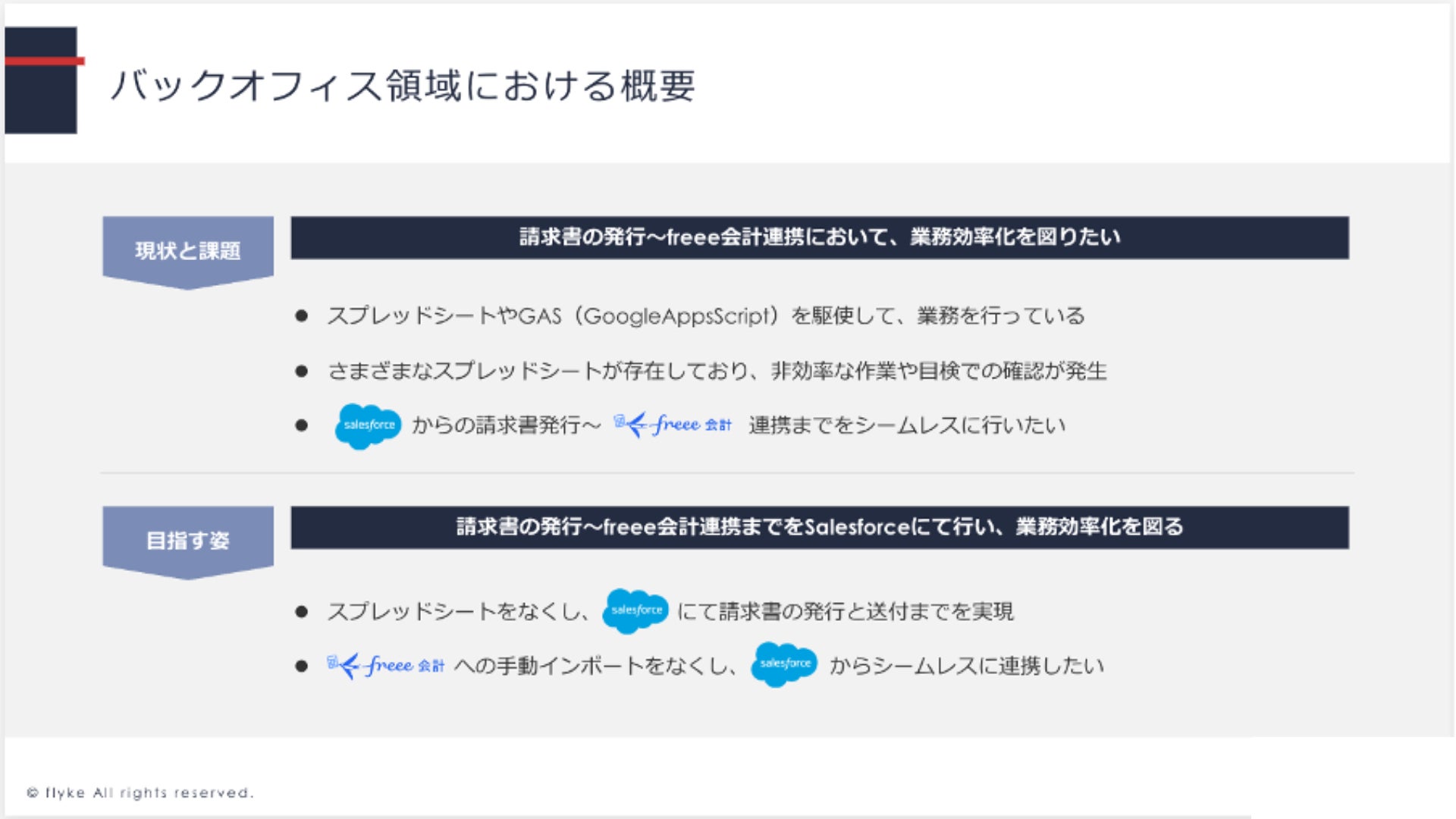 【当初の課題】 ・請求書発行などを処理するオペレーションが増え、人を投下しないと処理しきれない状態 ・Salesforceのライセンス付与に制約があり、全社員が情報にアクセスできず、それによりライセンスを持っている上長と部下間で、コミュニケーションエラーが発生 ・部署ごとに使用するツールが異なるため、ツール同士の連携が部分最適に |