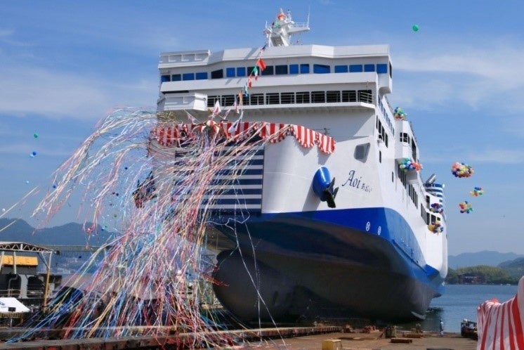 近年の海上輸送に対するニーズの高まりを受け、船体を約1.4倍大型化して輸送力を強化するとともに、安全性と省エネ性の向上も実現しています。客室は「瀬戸内海に浮かぶテラスリゾート」をコンセプトに、ワンランク上の船旅が楽しめる空間を作り上げています。「あおい」は5月28日に進水式を終え、現在、艤装岸壁にて内装工事を進めています。