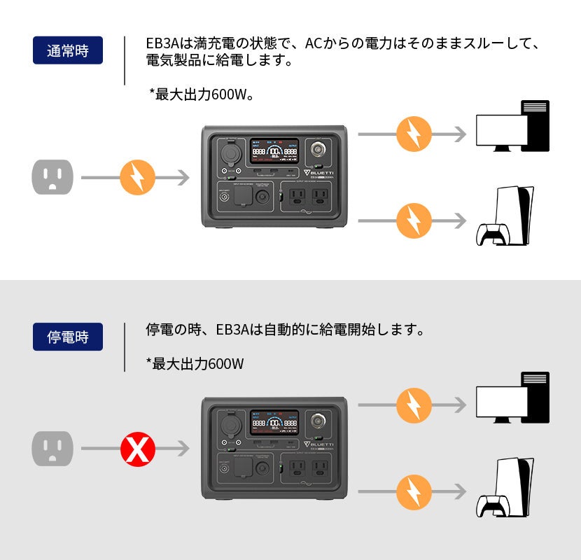 軽量な小型ポータブル電源ですが、UPS(無停電電源装置)機能付きで、突然の停電が発生してもデータの消失やデバイスの破損は心配ありません。