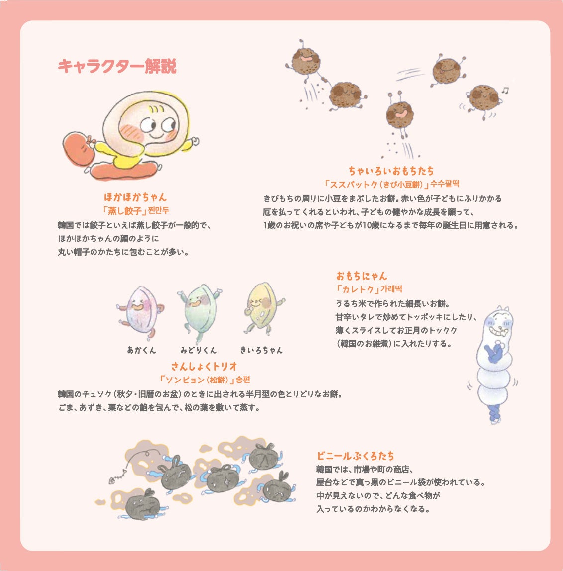 本書は蒸し餃子、色々なお餅、謎の真っ黒なビニール袋などの韓国ならではの食材や文化が織り込まれた内容になっており、それらを巻末のキャラクター解説で詳しく説明しています。