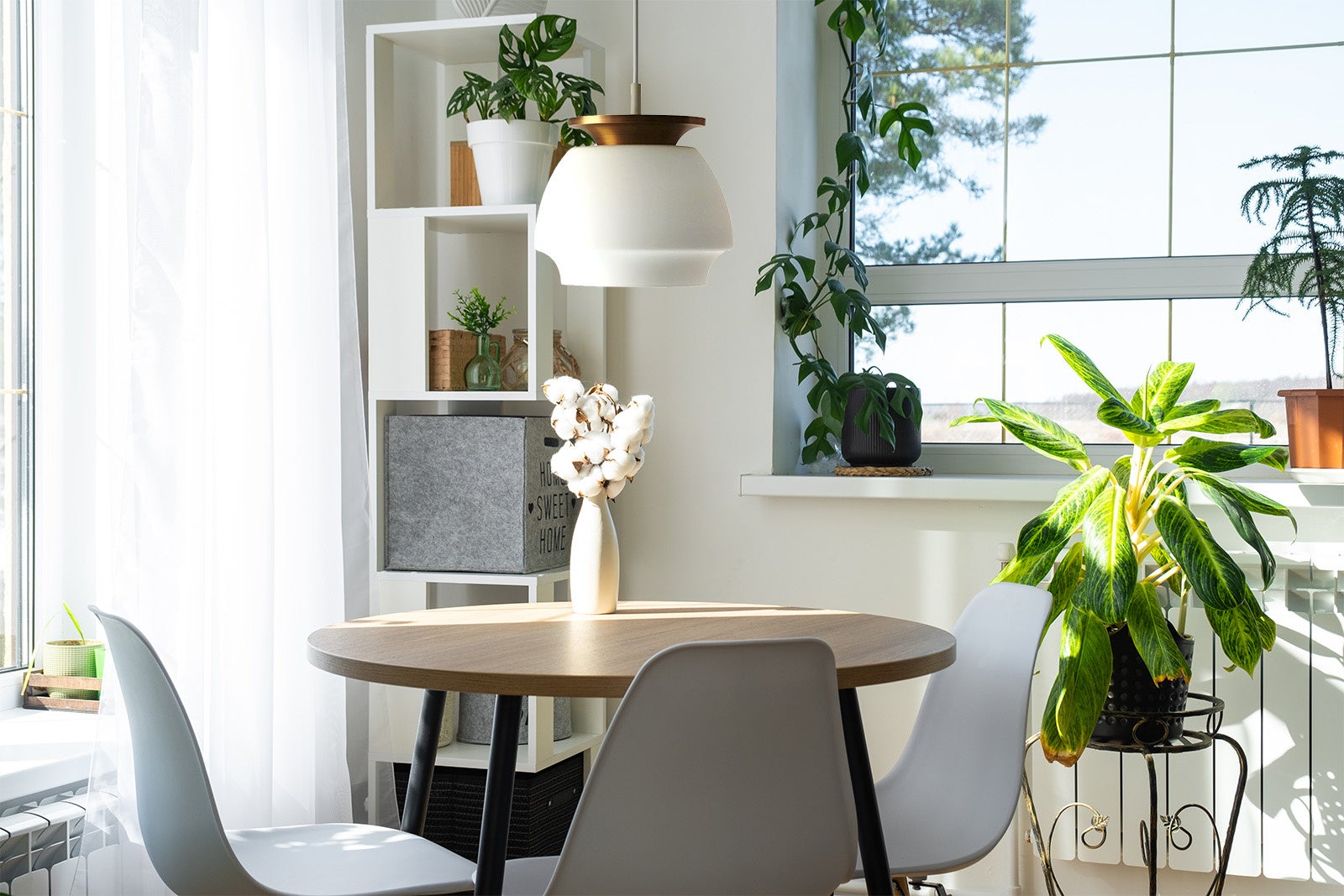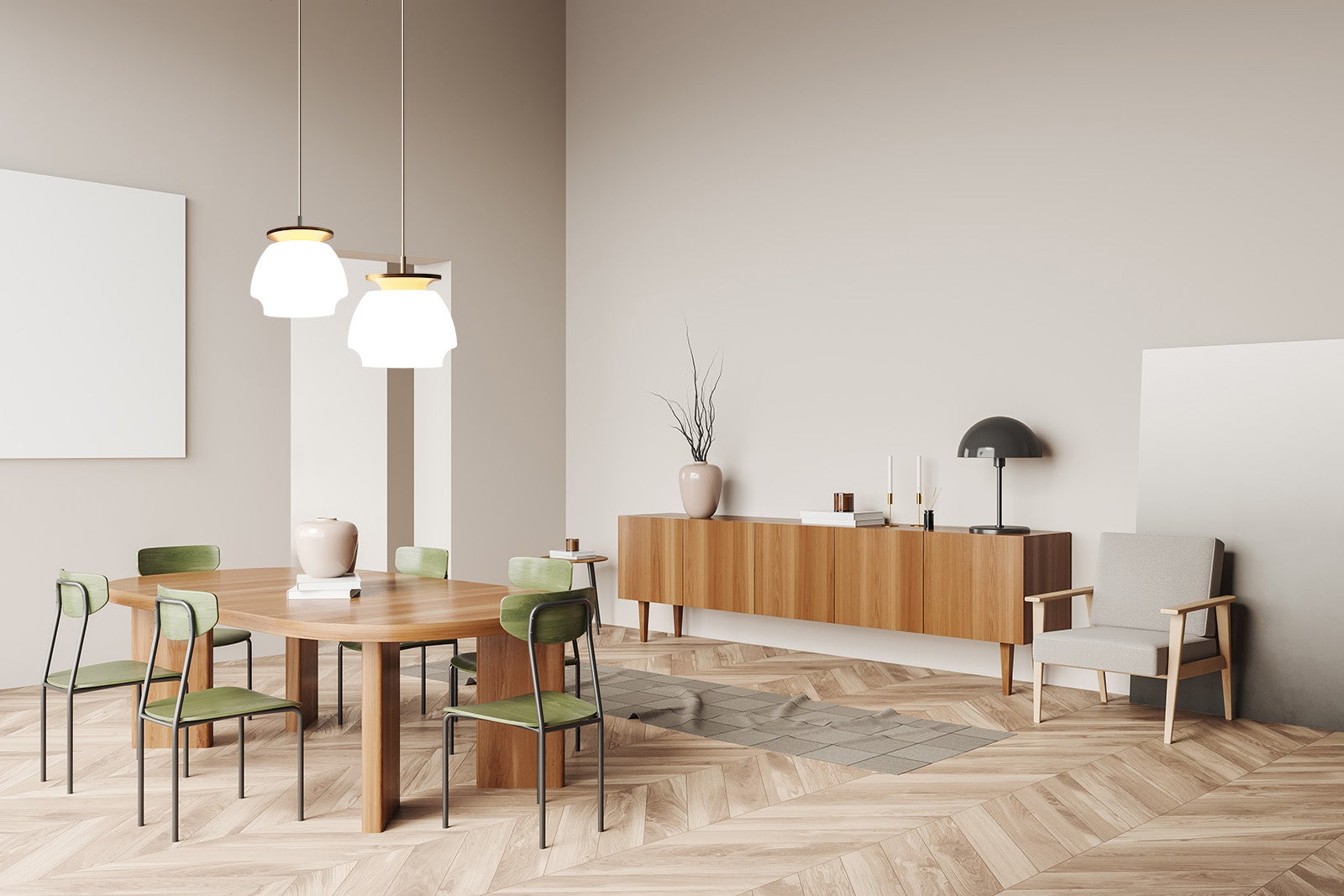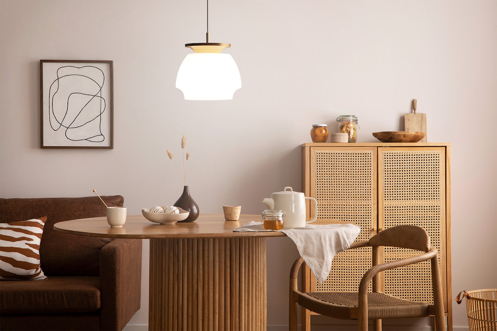 北欧照明にインスピレーションを受けてデザインされたこの照明は電球が直接見えないような設計(グレアレス設計)になっており、覗き込まない限り電球が見えないようになっています。さらに素材や形状で光がより広く拡散するフォルムとなっていて1灯でも十分なあかりを取ることができます。
