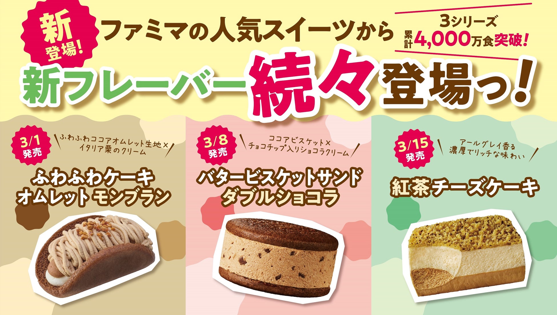 ファミマ スイーツの春到来!3シリーズ累計4,000万食を販売!人気スイーツの新作が3週連続で登場!こだわりの新フレーバーを3月1日(火)より順次発売!