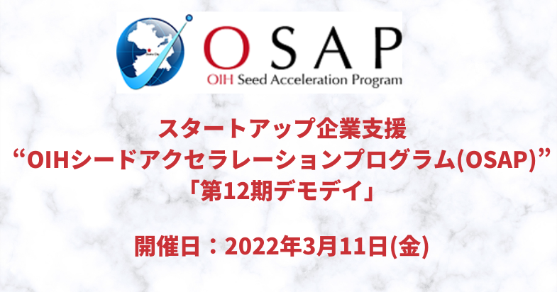 公益財団法人大阪産業局では、創業前後(シード期)のスタートアップ企業を支援する「OIHシードアクセラレーションプログラム(OSAP)」の第12期を実施してまいりました。(令和3年11月21日報道発表済み)。この度、その成果を発表する「第12期デモデイ」を令和4年3月11日(金曜日)にライブ配信にて開催します。