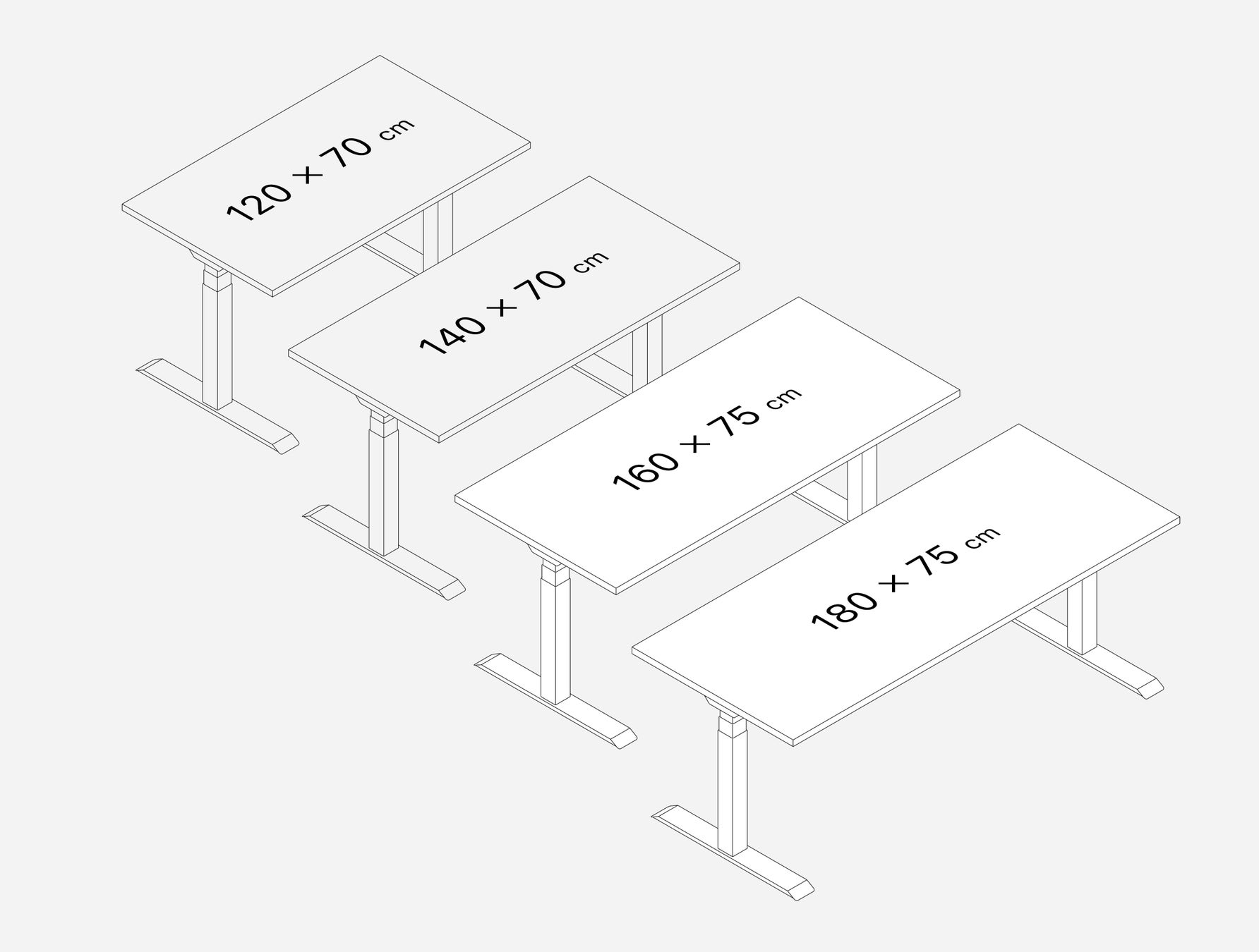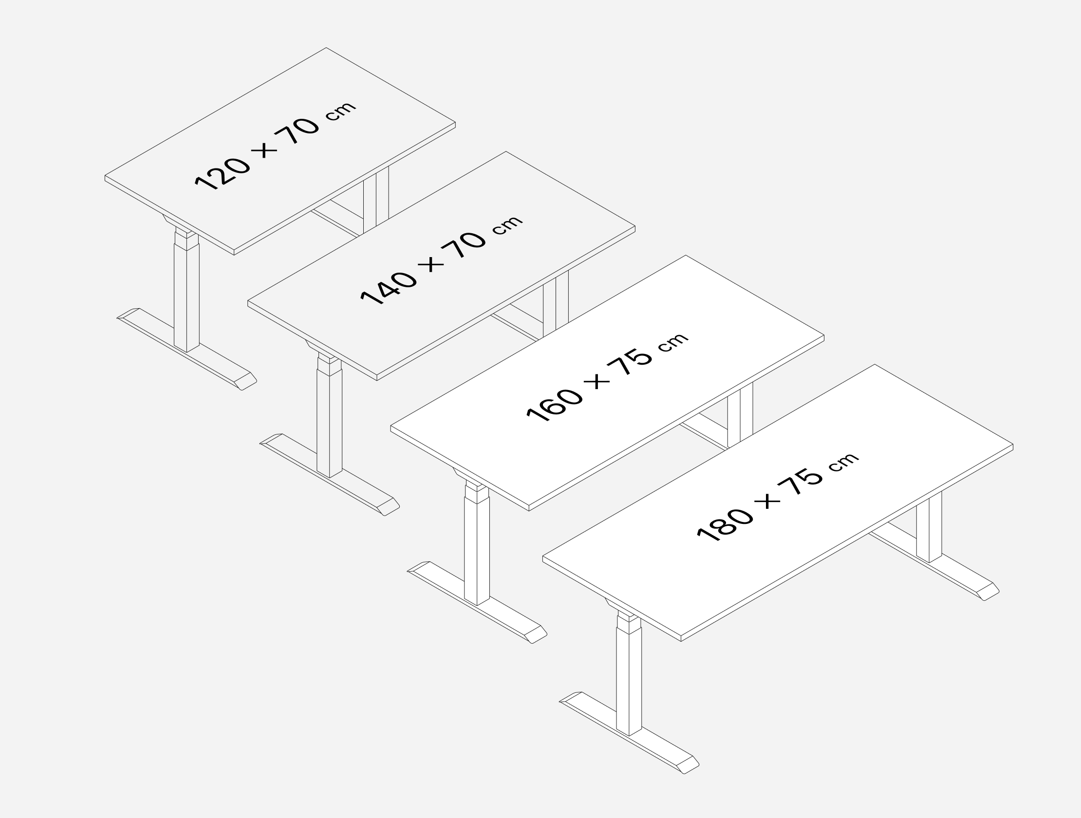 幅160cm × 奥行き75cm / 幅180cm × 奥行き75cm の2種類のモデルになります。それぞれ、電動昇降脚 FlexiSpot E7 とセットの昇降モデルと天板のみからお選びいただけます。