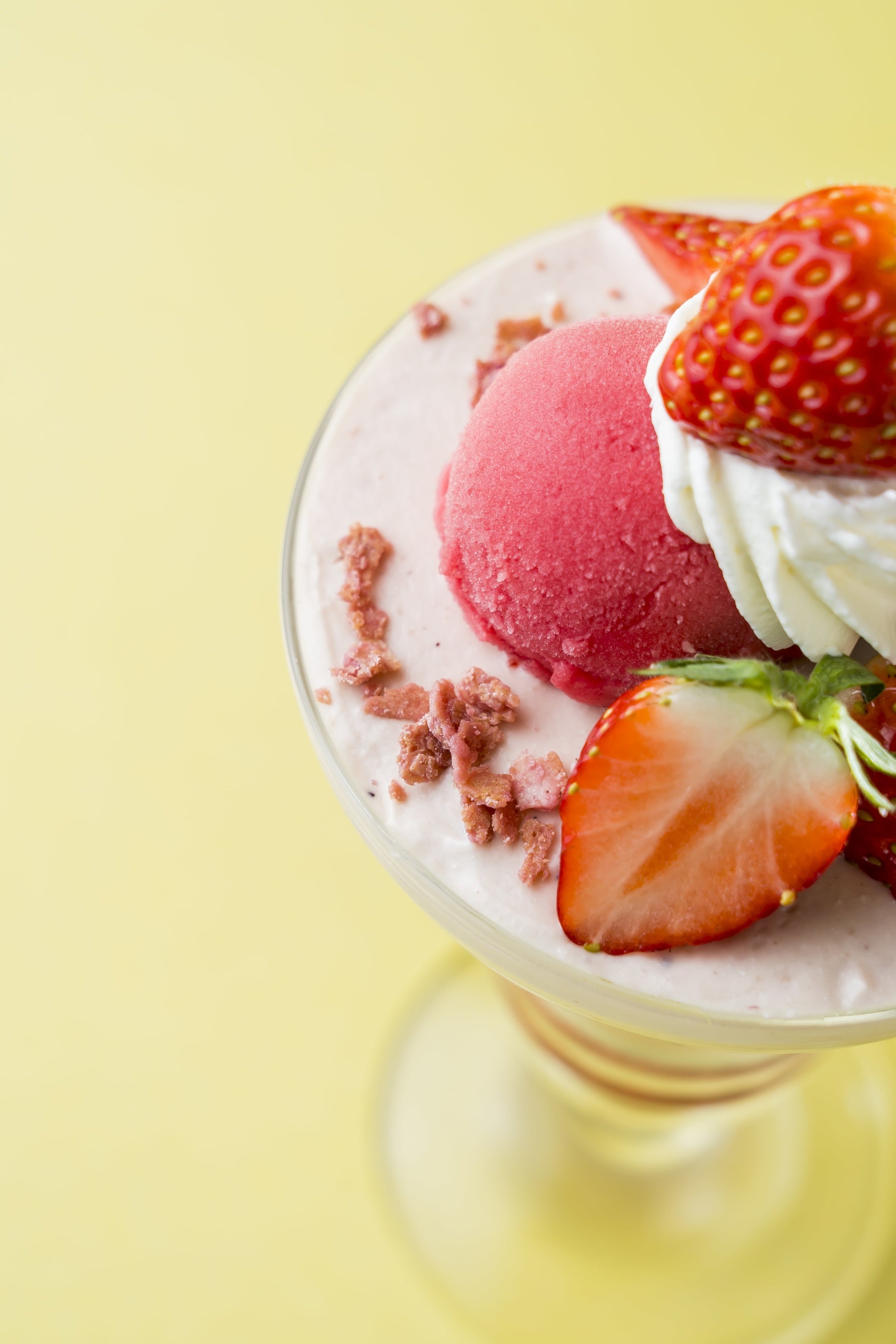 さらにその上にベリーの甘酸っぱさを感じるベリーマスカルポーネをたっぷりとのせ、爽やかなフランボワーズシャーベットとほろ苦濃厚な抹茶アイス、フレッシュなイチゴを飾りました。