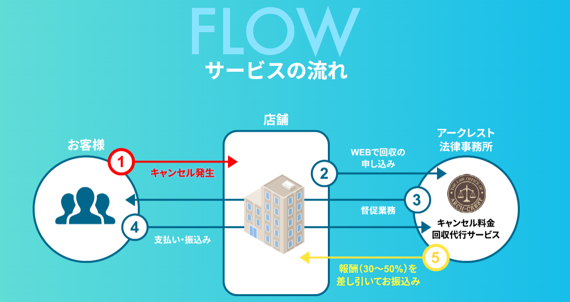 本サービスは、お店のオーナー様に代わって、キャンセルによる損失を弁護士が回収するサービスです。
