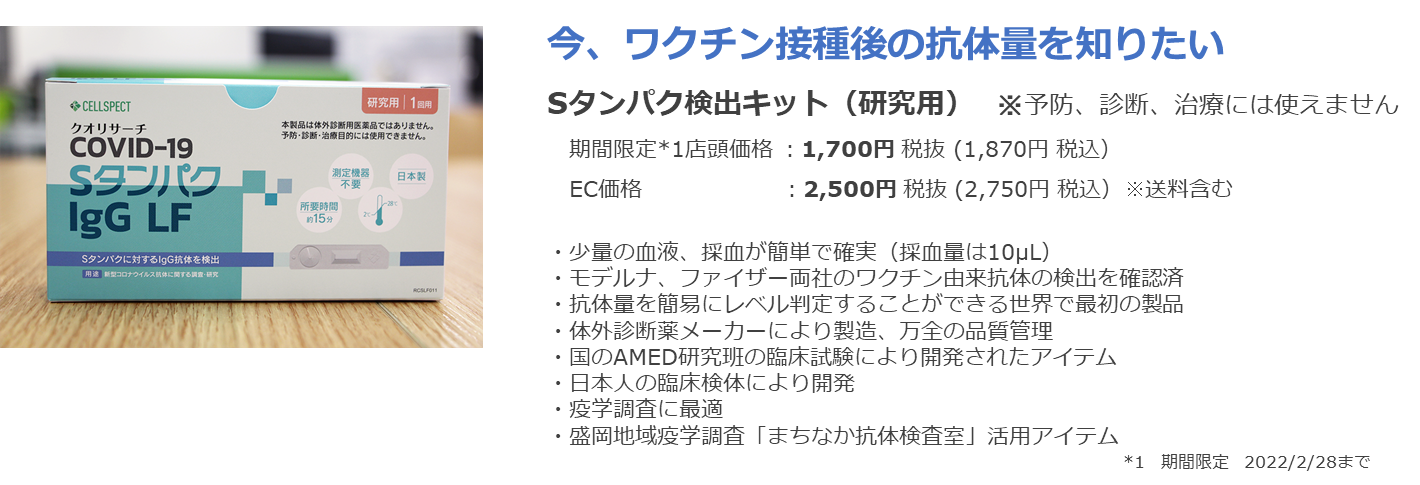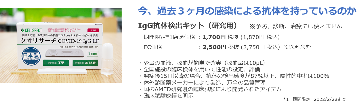 2022年1月24日には「クオンパスCOVID-19 抗原検査キット」を、企業、団体、法人、自治体等向けに提供開始し、ご好評により3日間で累計10,000個受注いたしました。
