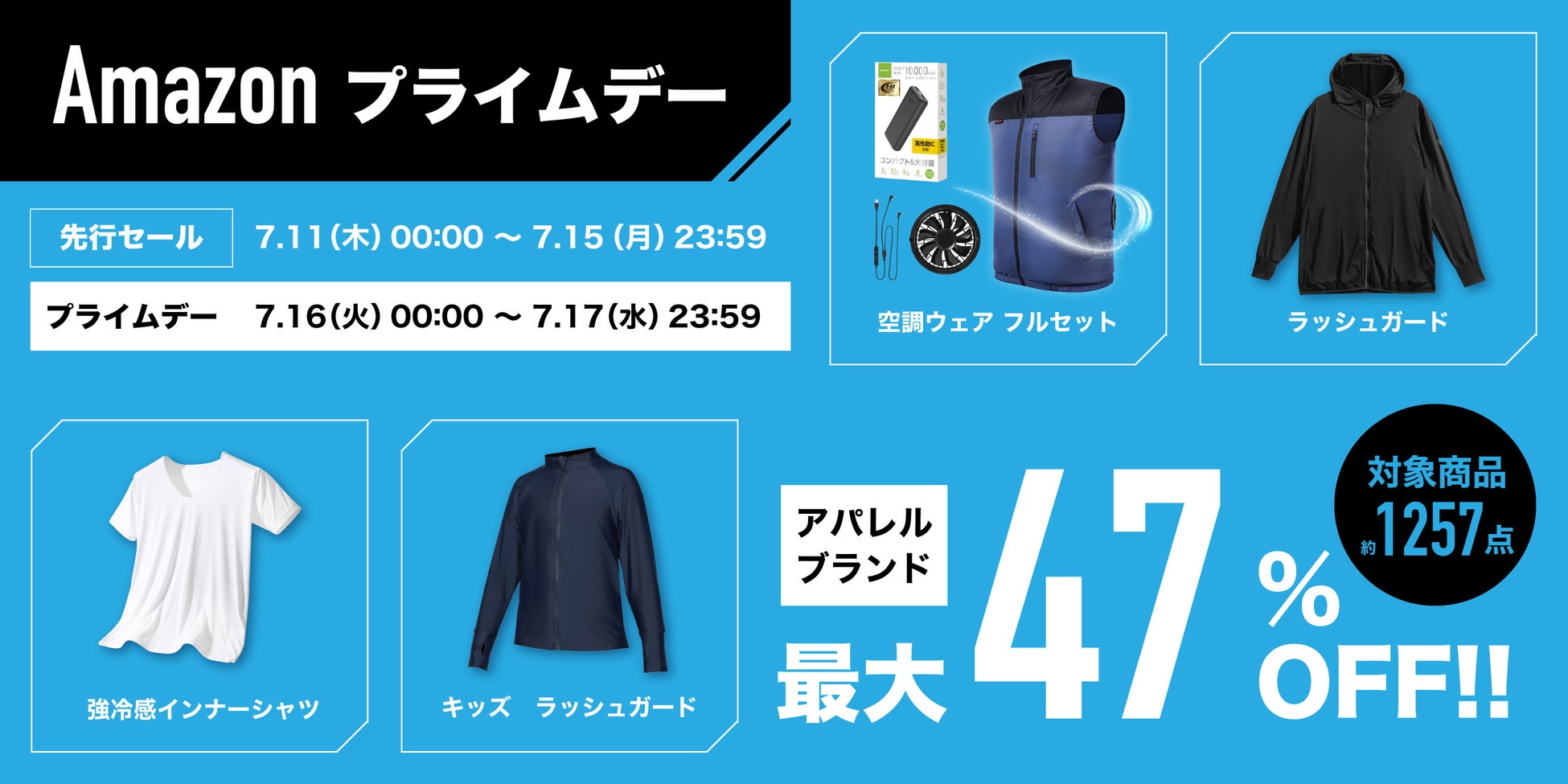 期間限定の目玉商品には、炎天下の作業や屋内での空調が利用できない状況でも大活躍する「空調ウェア」、着た瞬間から高い冷感効果を実感できる「強冷感インナーシャツ」、紫外線カット率99.9%以上の「ラッシュガード」。Amazonプライムデーだけの期間限定でお得な価格でご購入いただけます。