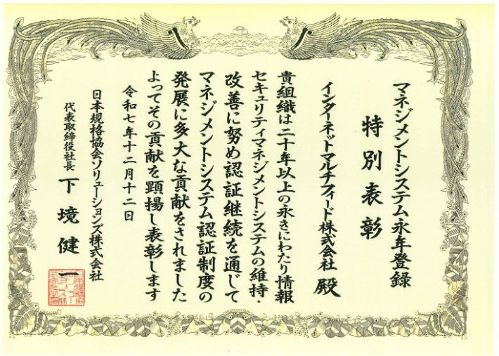 インターネットマルチフィード株式会社(以下、当社という)は、この度、日本規格協会ソリューションズ株式会社より、ISO27001(ISMS)の「マネジメントシステム永年登録(特別表彰)」を受賞いたしました。