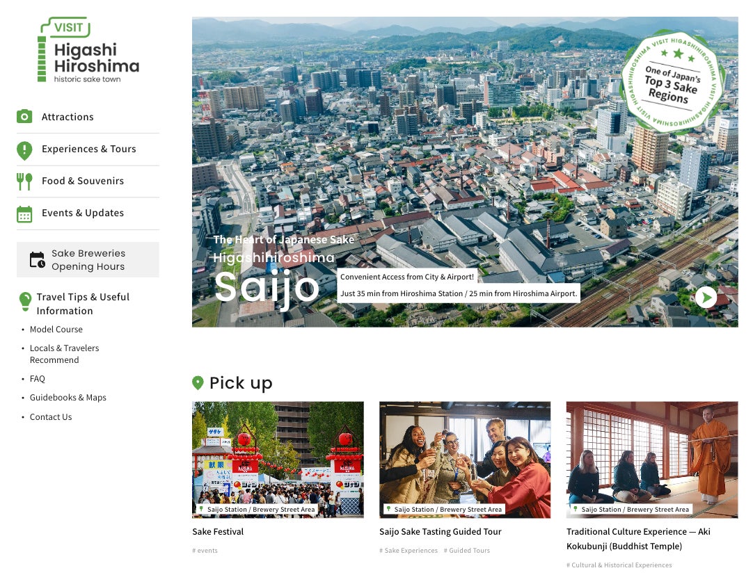 2025年10月2日(木)、一般社団法人ディスカバー東広島は、外国人観光客向け英語の観光サイト「Visit Higashihiroshima」を公開しました。本サイトは外国人観光客に対し、英語で東広島市の観光情報をわかりやすく、効果的に発信することを目的としたウェブサイトです。