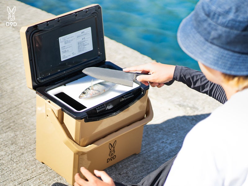 魚をさばけるまな板セットが内蔵された10Lサイズの小型クーラーボックス。