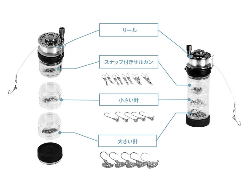 ラインナップの中でも注目の「釣りボトル」は、針が収納されたボトルの先端に糸付きのリールが合体している、竿がないオールインワン釣具。