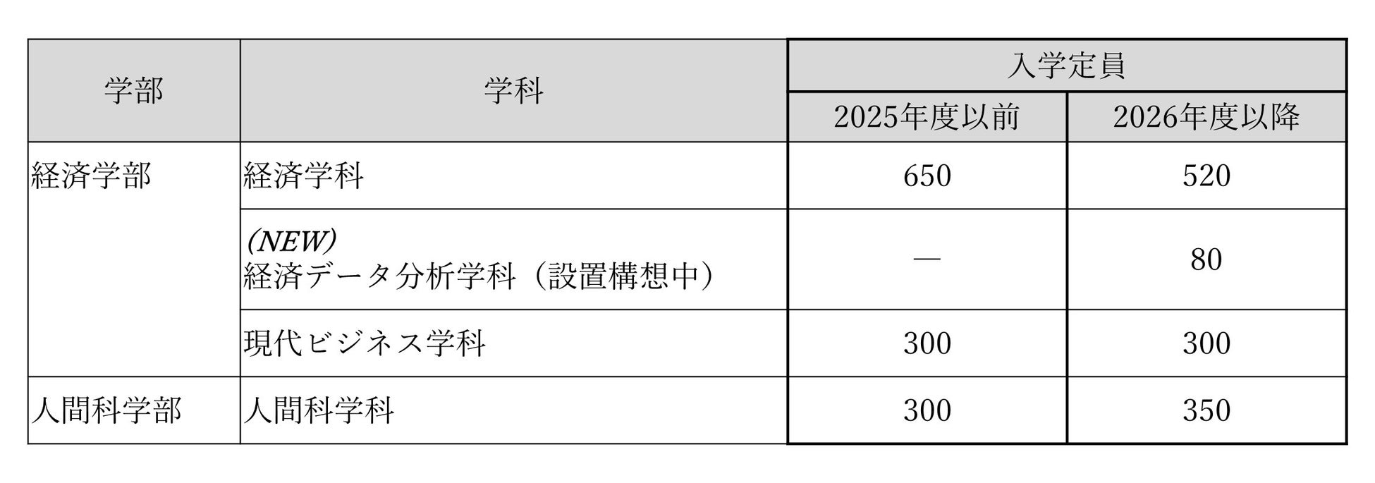 経済学部と人間科学部の入学定員変更について