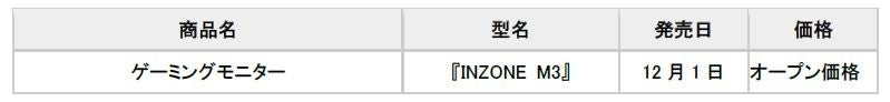 ソニーマーケティングは、ゲーミングギアの新ブランド「INZONE™」(インゾーン)シリーズにおいて、年内発売予定の『INZONE M3』を11月17日(木)に予約開始、12月1日(木)発売に決定しました。