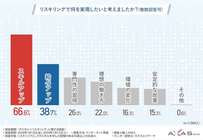 「Q:どのような目的でリスキリングを始めましたか?」の回答と合わせて考察すると、『スキルアップ(66.6%)』をして現職での活躍に直結させたいと考える方が多いことがうかがえます。