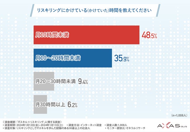 【時間】約8割がリスキリングにかけている時間は月20時間未満と回答。