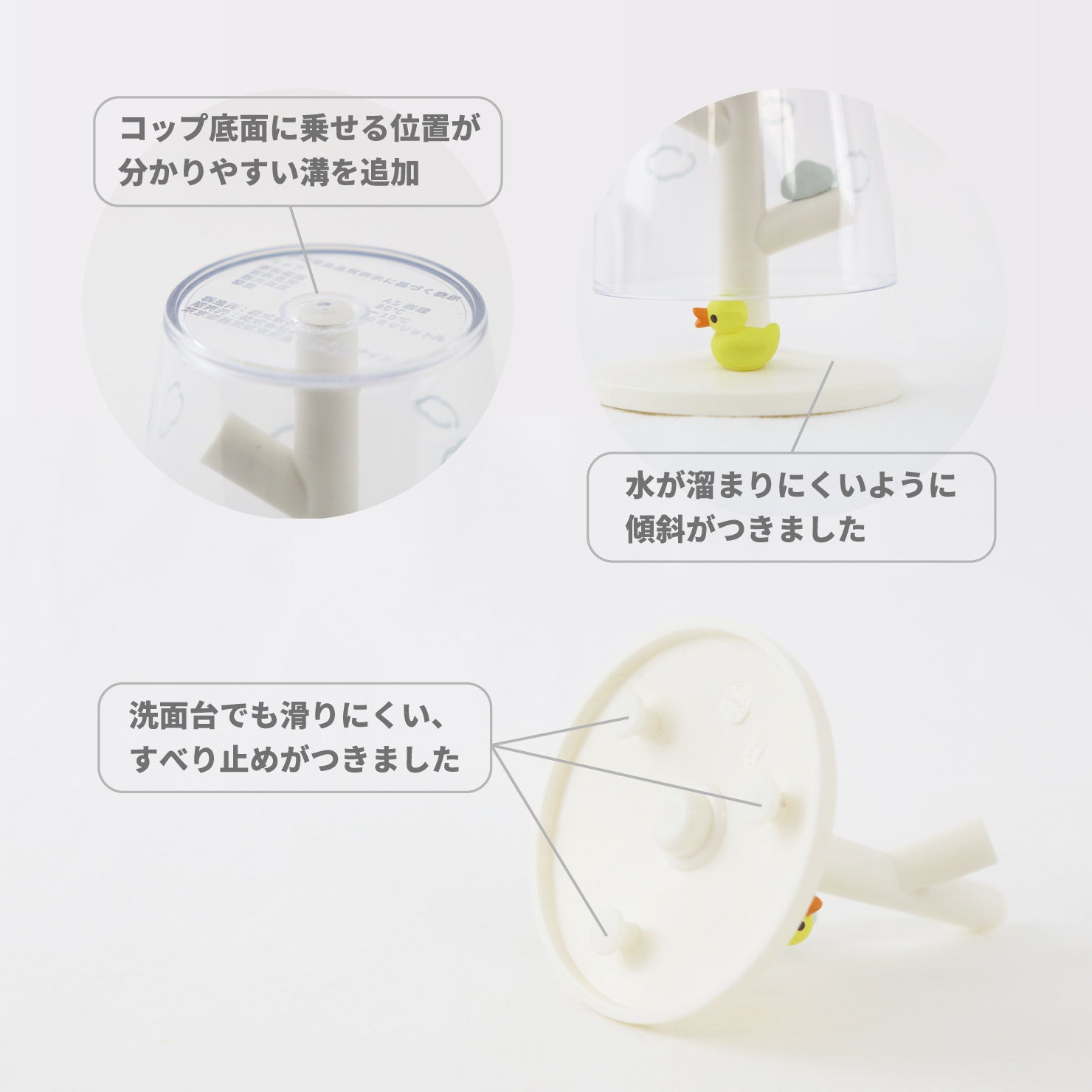 スタンドトップにシリコンキャップを追加しました。コップをかけるとき、コップの位置を固定しやすく、使い勝手がよくなりました!また、スタンドの裏面には滑り止め付き!(※画像はオリジナルのミニコップ&スタンドです。)