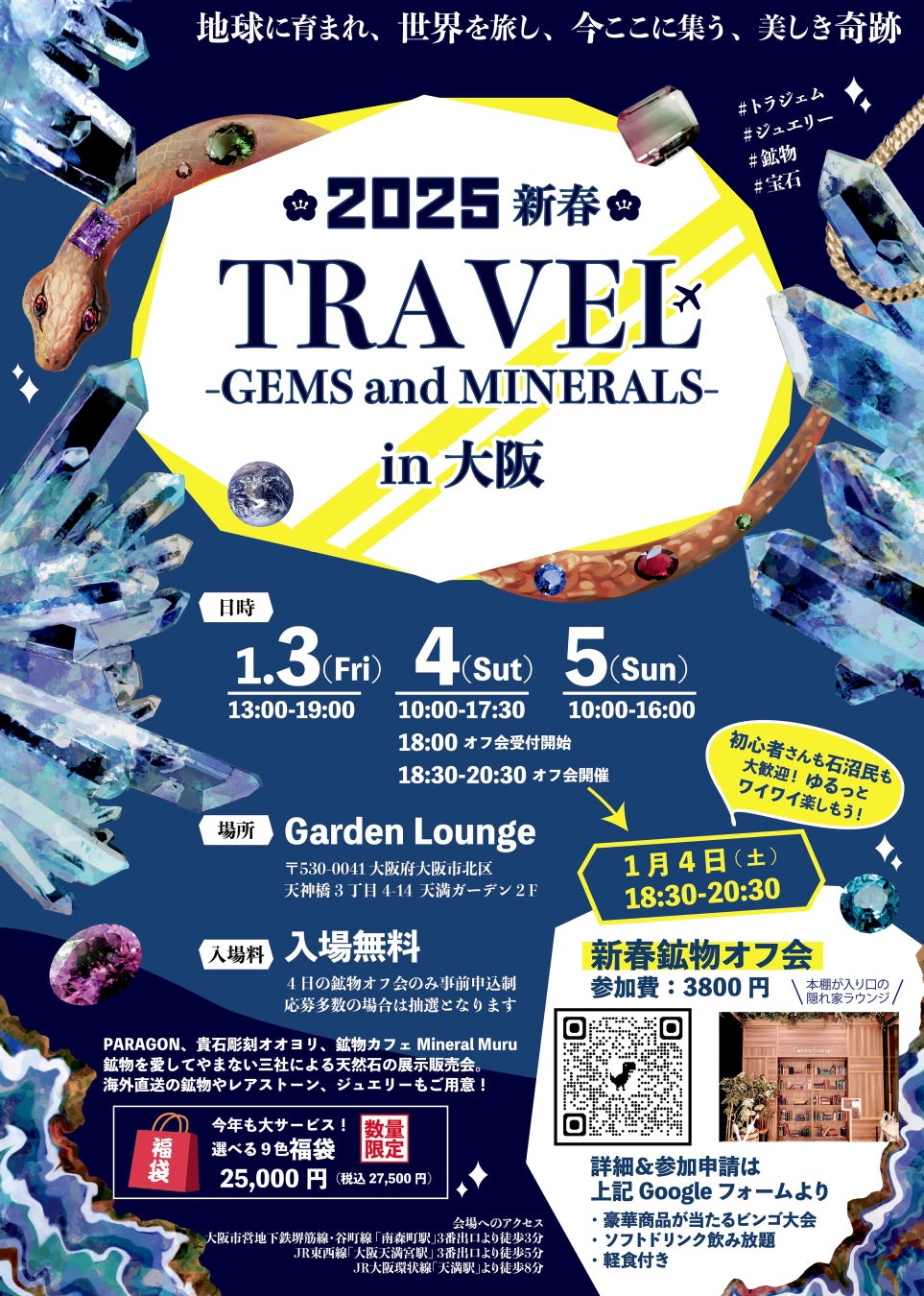 鉱物&カフェ Mineral Muru(運営:株式会社ワンダーマイン/兵庫県伊丹市稲野町1-85-1)、株式会社PARAGON(大阪府大阪市住道矢田4-16-11)、貴石彫刻オオヨリ(山梨県甲府市住吉1-16-4)は、天然石の展示販売イベント「TRAVEL -GEMS and MINERALS-」を2025年1月3日(金)〜1月5日(日)に開催します。