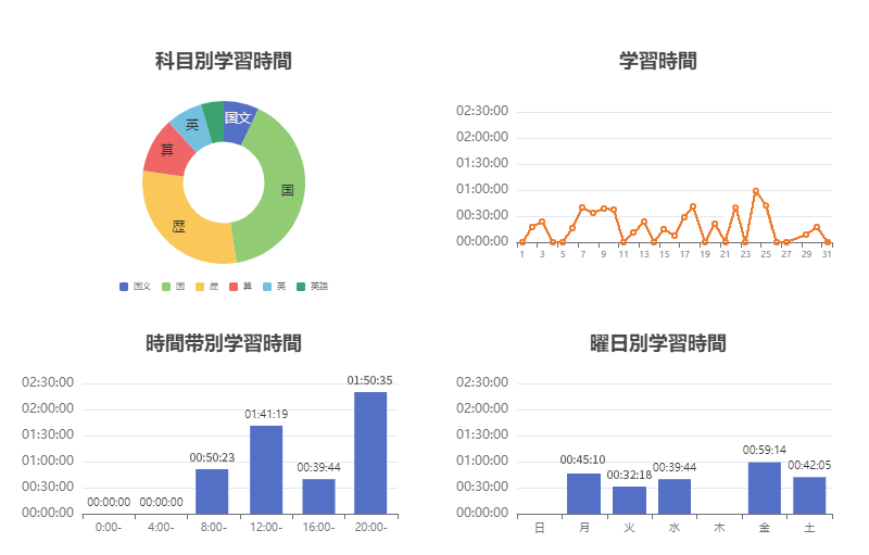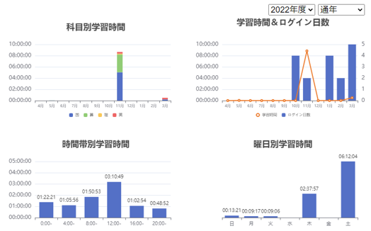 - 個人…トップ画面上で、生徒ごとの学習状況がグラフで視覚化され、簡単に把握できます。また、通年・月ごとの学習時間推移を確認することもできるようになります。