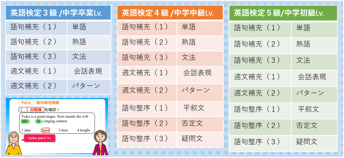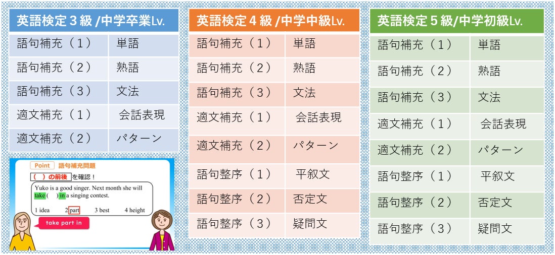 - アップデート内容(2):「英語検定」科目の追加 小学1年生から中学3年生までの各学年に、「英語検定」の3級・4級・5級対策が科目として追加されます。授業動画・基本問題・チャレンジ問題・キミ問も搭載され、他の科目と同じように学習できます。