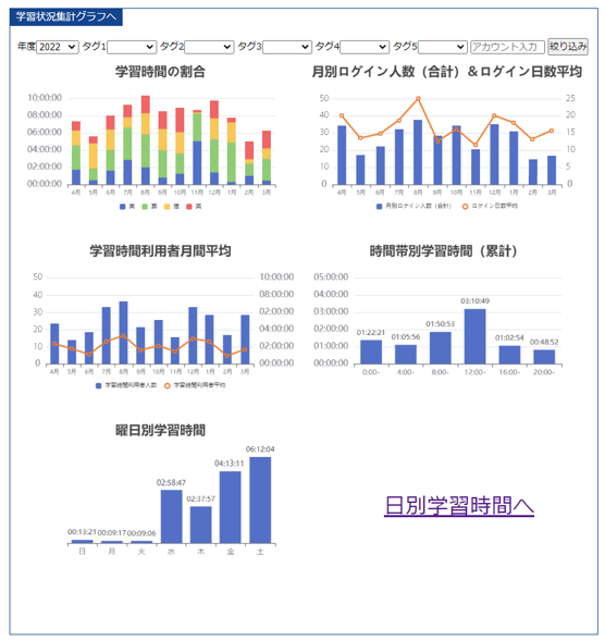 - アップデート内容(1):管理画面での学習状況の可視化 教室全体…トップ画面上で、教室の全生徒の学習状況がグラフで視覚化されることで、教室全体の利用状況が簡単に把握できるようになります。また、タグ設定をすることにより、学年ごと・担任ごとに生徒の学習状況を確認することも可能です。