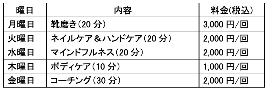 出張や商談の前後に体験できるサービスを日替わりで提供します。この機会にぜひ新たなサービスをご利用してみてください。