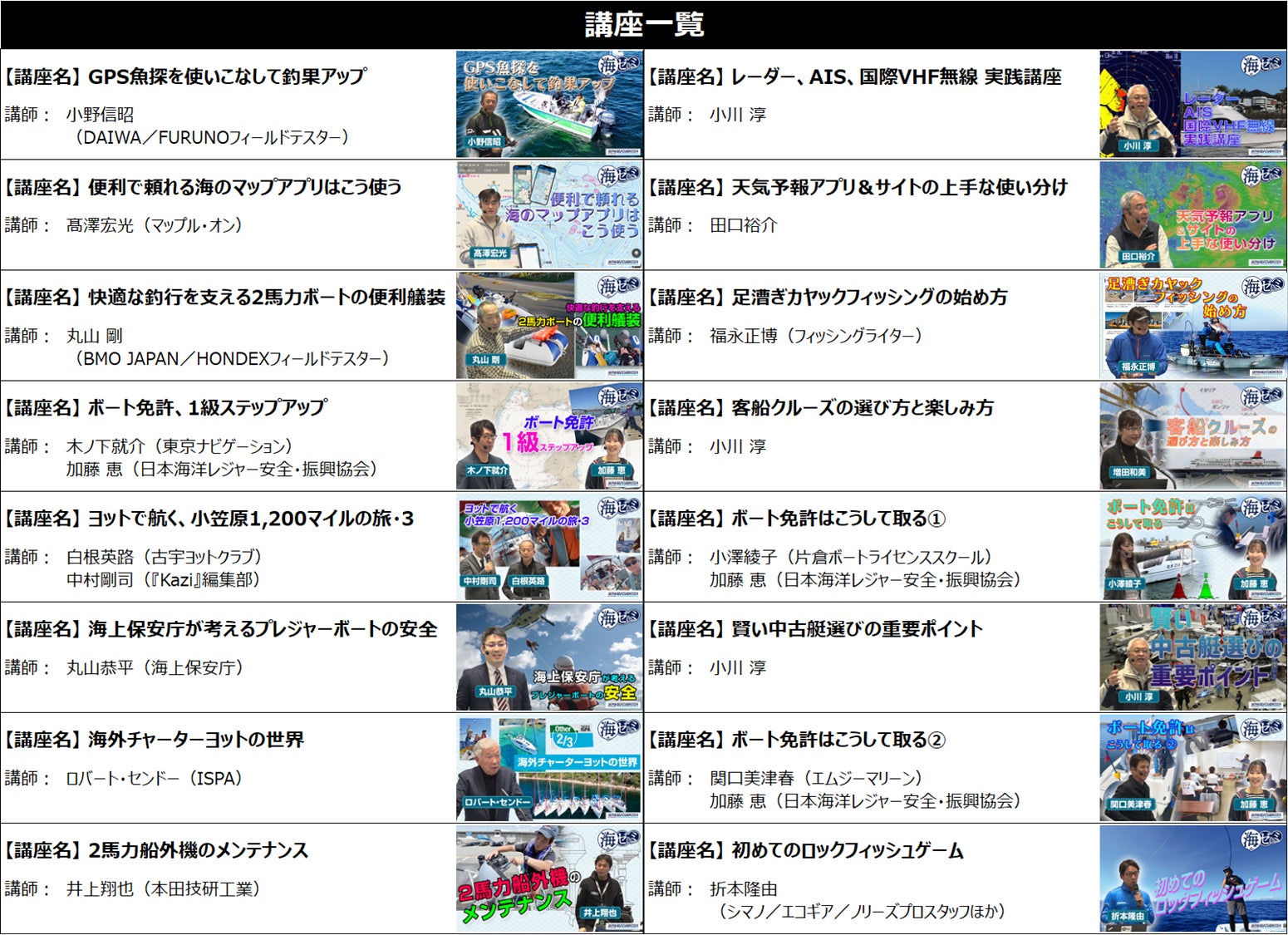 「楽しく学べるマリン」を合い言葉に、海のエキスパートが教えてくれる、とっておきの16講座を掲載します。初心者からベテランまでを対象とした「海ゼミ」では、海の遊びを楽しむには欠かせないノウハウを、各分野のエキスパートが伝授。ボート、ヨット、フィッシング、安全、免許といったテーマに加え、客船クルーズや海外チャーターヨットなど夢がふくらむプログラムを用意しています。