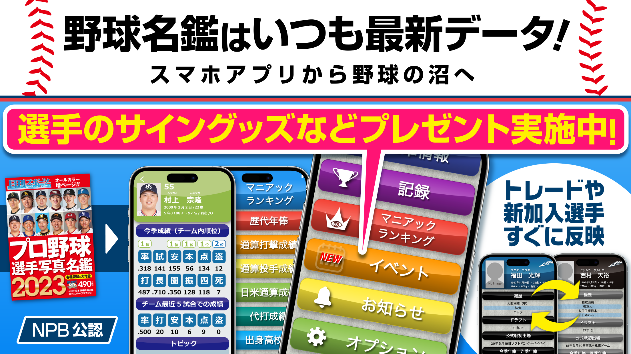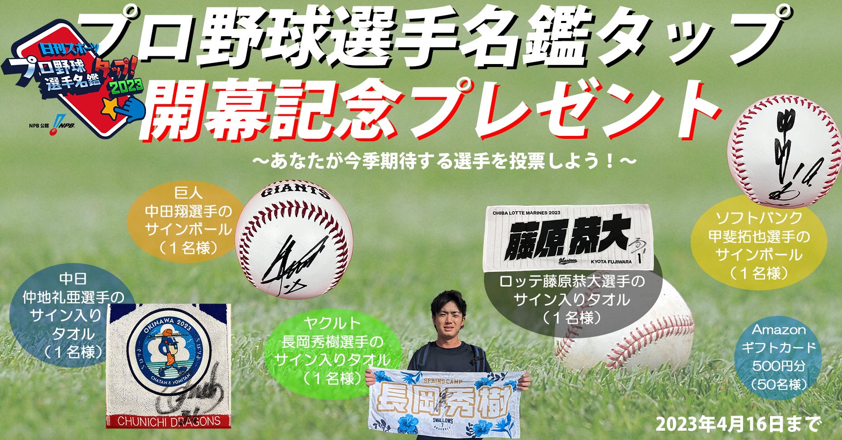 祝プロ野球開幕! WBCで世界一に輝いた日本代表選手もチームに戻り、2023年のプロ野球が3月30日に開幕します。試合観戦に欠かせないプロ野球名鑑をアプリ化した「プロ野球選手名鑑タップ!」では、開幕を記念して新たなプレゼントキャンペーンを開催しています。アプリをダウンロードして、ぜひご応募ください。