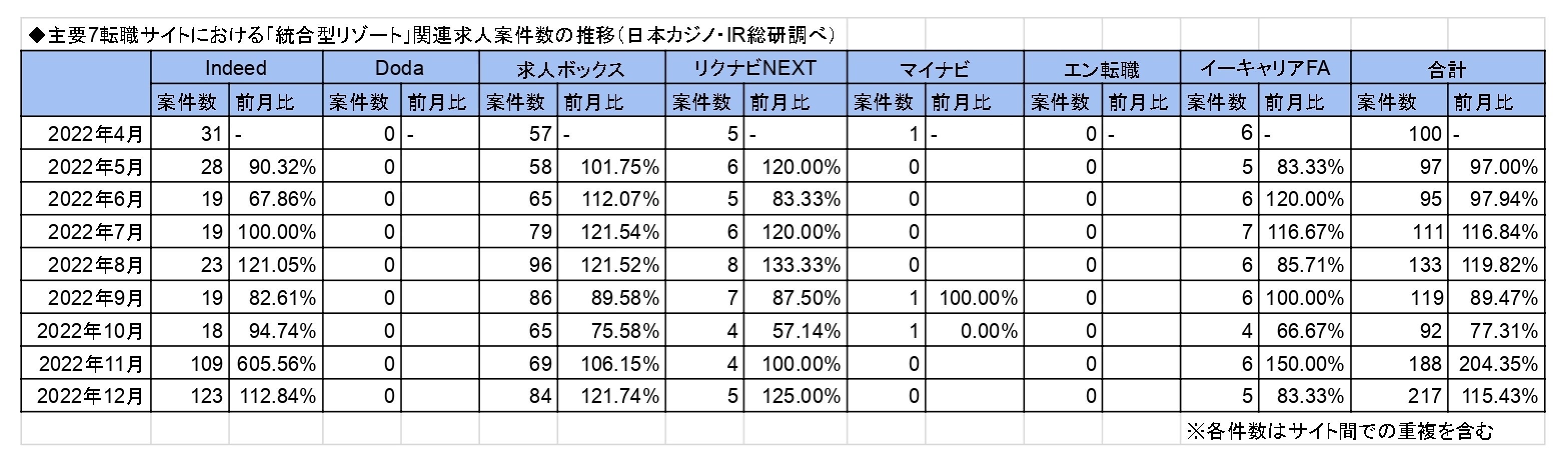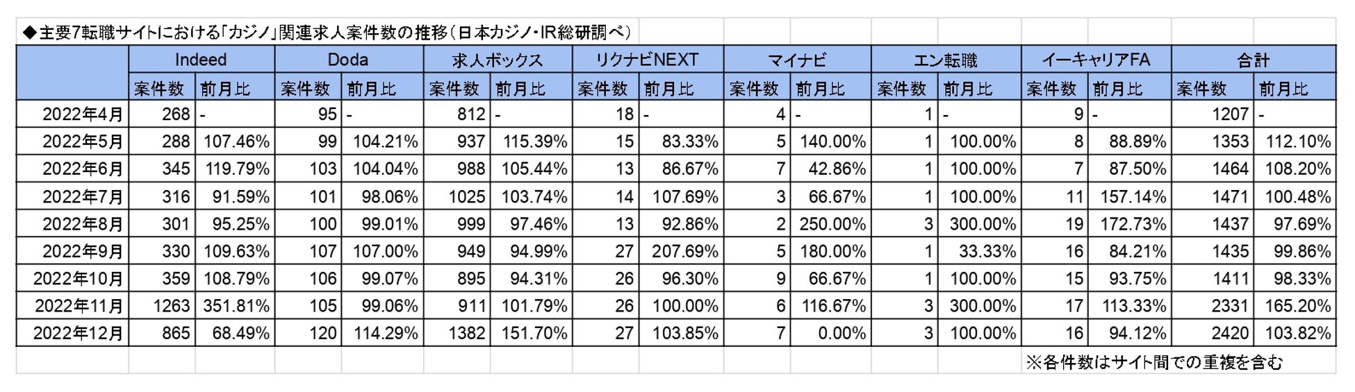 カジノIR業界専門ニュースメディア「日本カジノ・IR総研」は、主要となる7つの転職サイトにおける2022年12月12日時点の「カジノ」と「統合型リゾート」に関連する求人案件数をそれぞれまとめました。