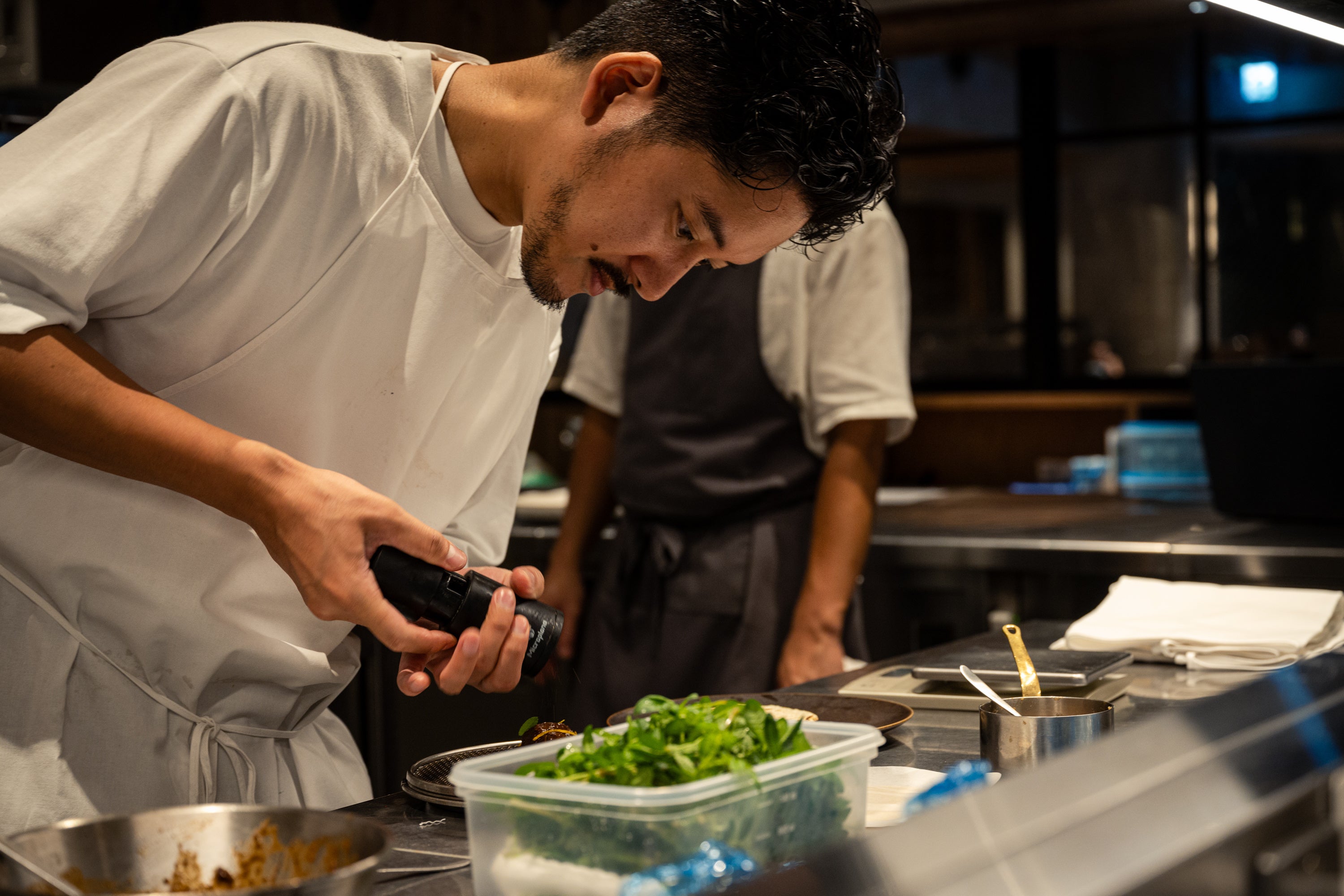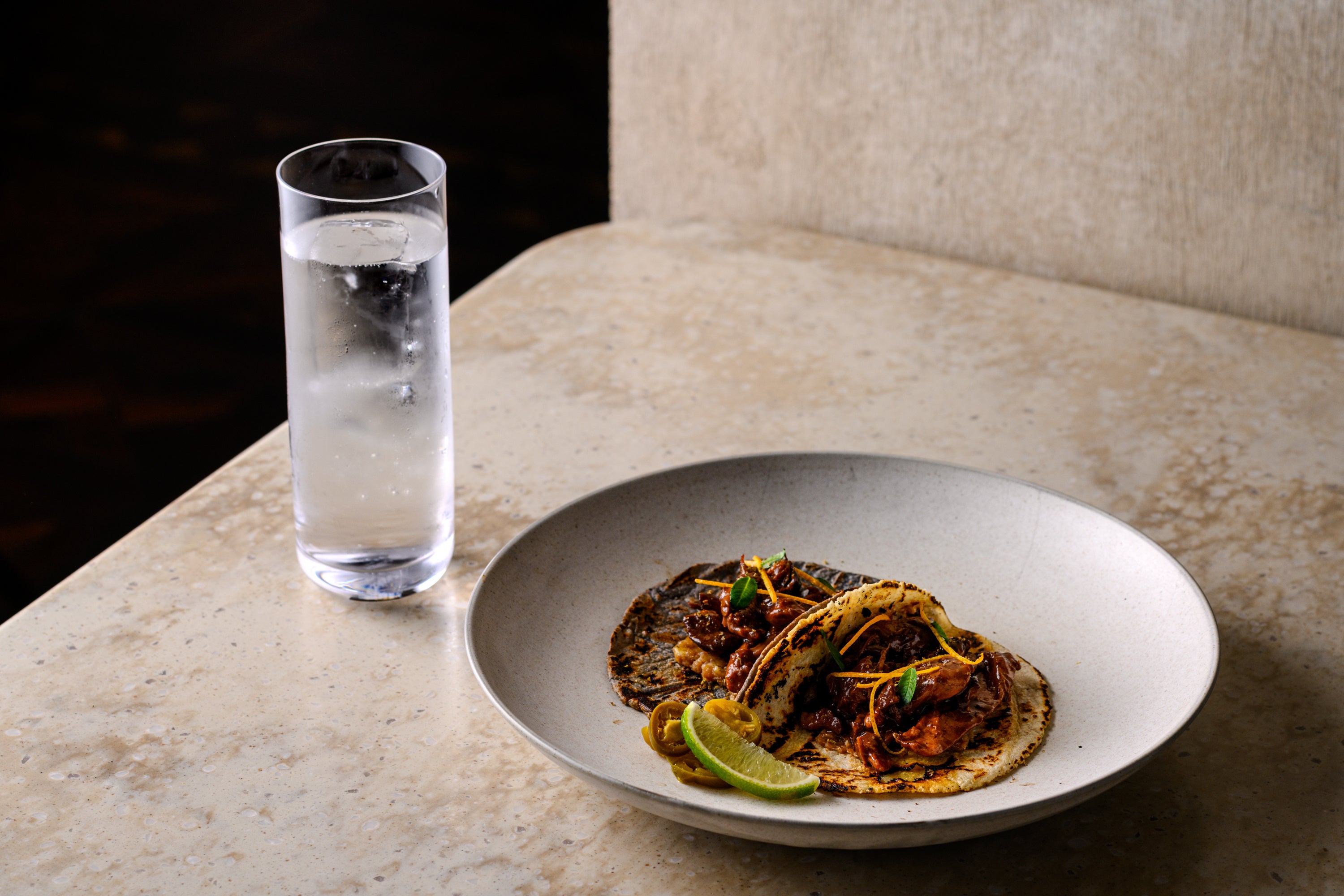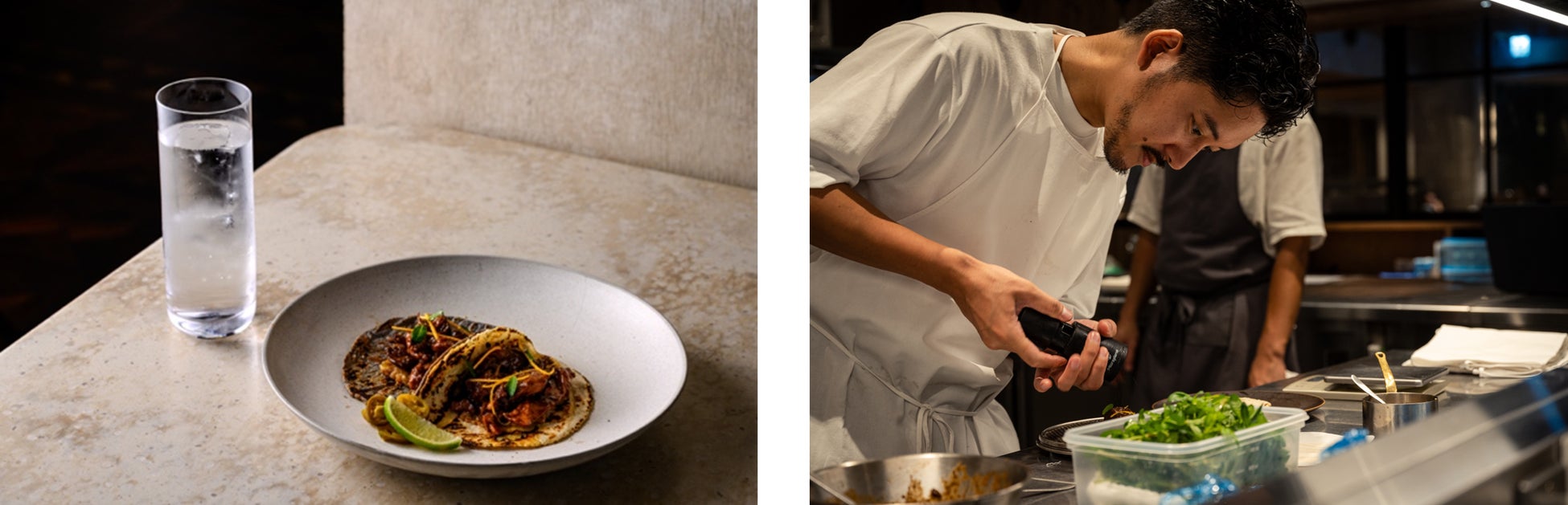 コック・オ・ヴァン(鶏の赤ワイン煮)にチョコレートとカカオの風味を纏わせ、2種のコーントルティーヤで包んだ、WONK長塚健斗氏のこだわりが詰まったスペシャルなタコスが完成。