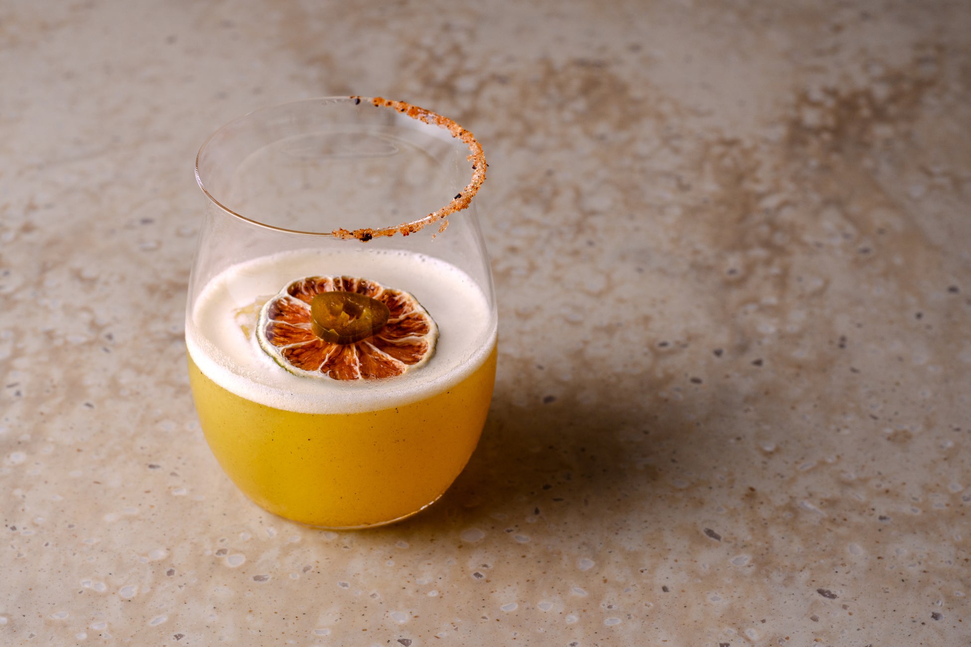 クラセアスール・テキーラ・プラタをベースに、テキーラカクテルの「マタドール」を再解釈した唯一無二のカクテル。フードに使用されているカカオの苦味と相性の良いスモーキーさを出すため、パインを炙ってからジュースにし、タコスには欠かせないハラペーニョをアクセントに、スパイシーなお食事とのバランスを意識しています。また、ブランドアンバサダーがメキシコの唐辛子8種類を独自にブレンドして作ったスパイシーソルトがカクテルにピリッとした刺激を加えます。
