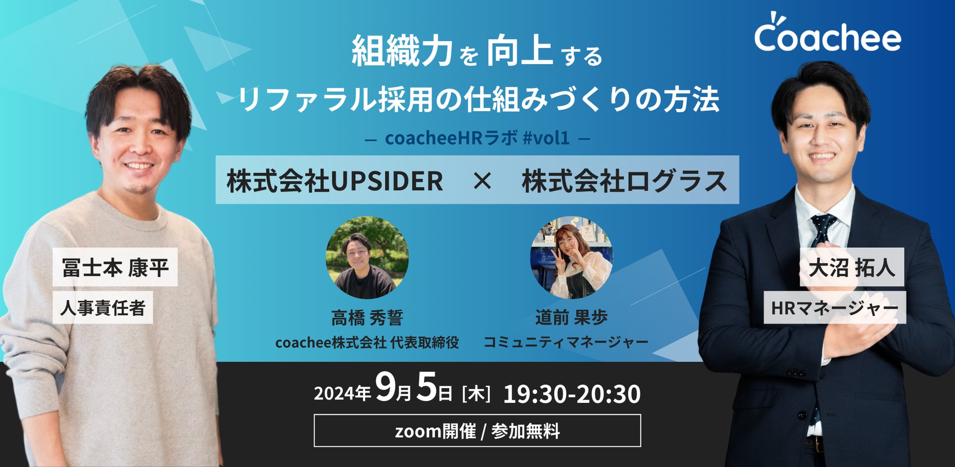 「人とテクノロジーで、個と組織の「関係性」をリデザインする」をミッションに、採用特化型人事シェアサービス事業「coachee人事シェア採用」やキャリア相談プラットフォーム「coachee」をはじめとする採用支援事業を展開するcoachee株式会社(本社:東京都渋谷区、代表取締役:高橋秀誓、以下 当社)は、9月5日(木)にcoachee HRラボ勉強会第1弾に株式会社ログラスHRマネージャー大沼氏と株式会社UPSIDER人事責任者冨士本氏をお招きし、リファラル採用をテーマにした勉強会を開催いたします。