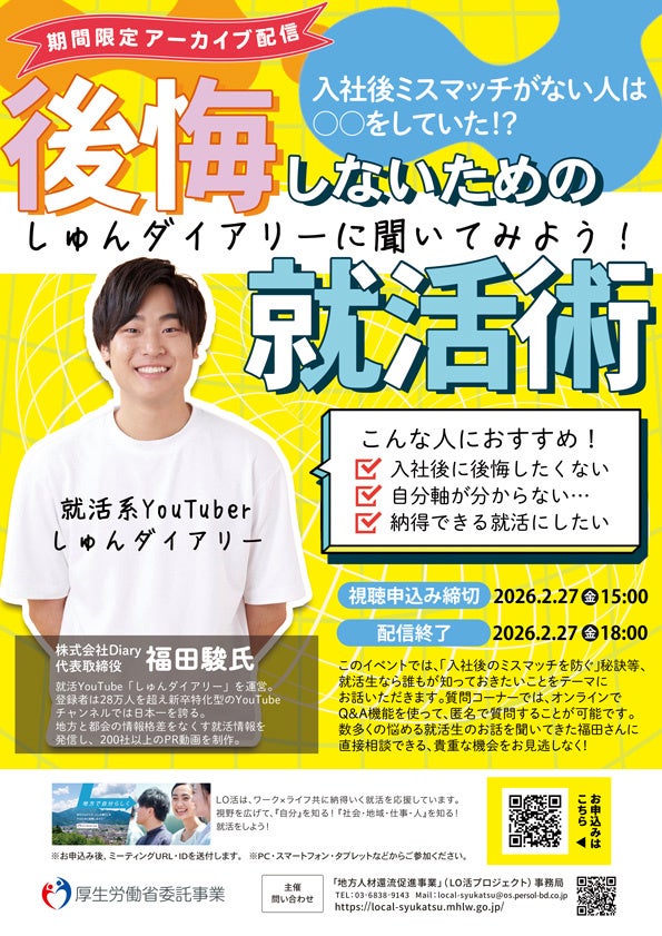 パーソルビジネスプロセスデザイン株式会社(本社: 東京都港区芝浦3丁目4-1、代表取締役社長: 市村 和幸)は、厚生労働省より受託している地方人材還流促進事業(LO活プロジェクト)にて、2025年12月2日(火)に、オンラインイベント「しゅんダイアリーに聞いてみよう!後悔しないための就活術」を開催しました。ゲストにYouTube「しゅんダイアリー就活チャンネル」を運営する福田駿氏を迎え、就活生が抱える不安や悩みに寄り添いながら、就活に役立つヒントを提供しています。