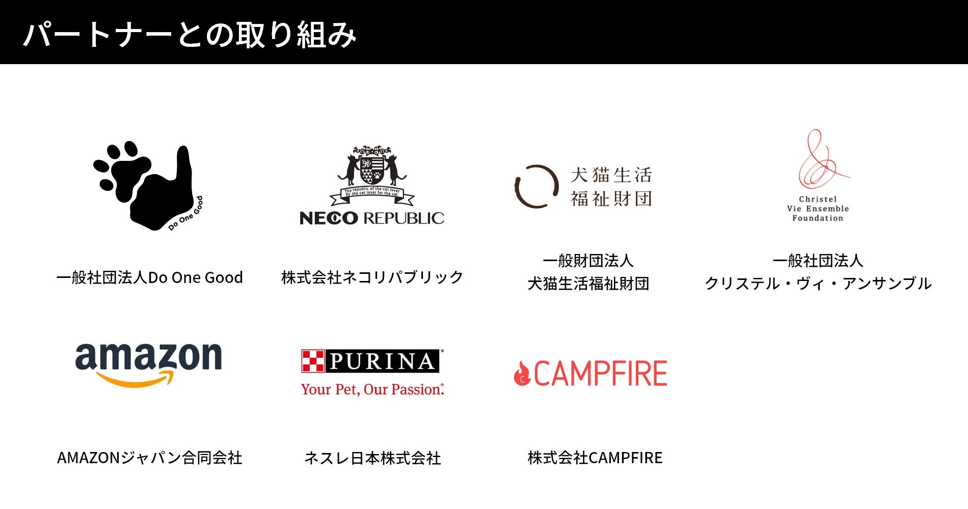 同じ志をもつパートナー企業と連携することで、当社のみでは成し得ない規模の社会的インパクトを創出していきます。具体的には、AMAZONジャパン合同会社の「保護犬・保護猫 支援プログラム」の審査およびプロジェクトサポートや犬猫生活福祉財団の助成金審査委員会 審査員等を行っています。